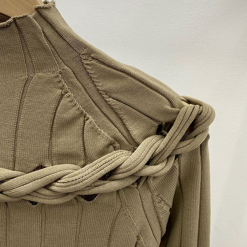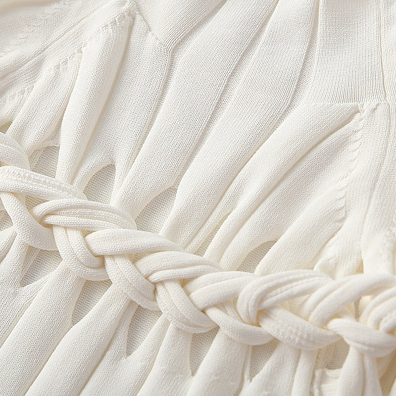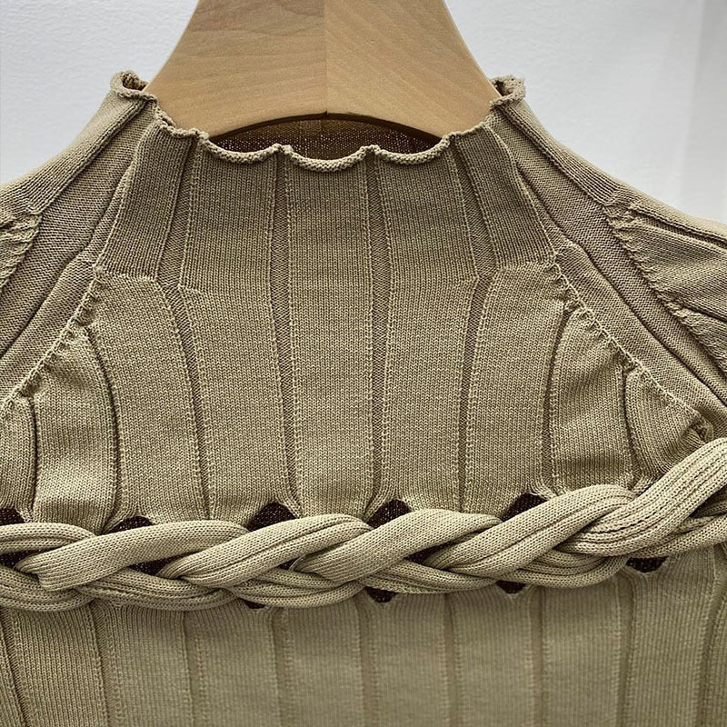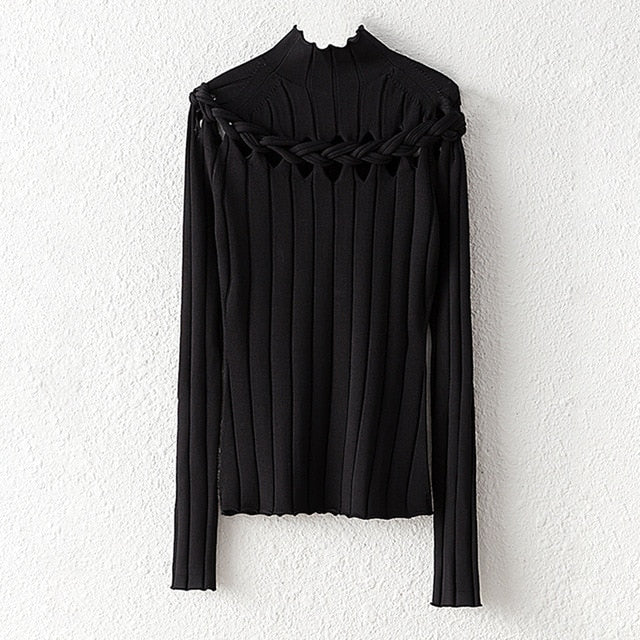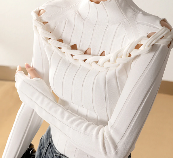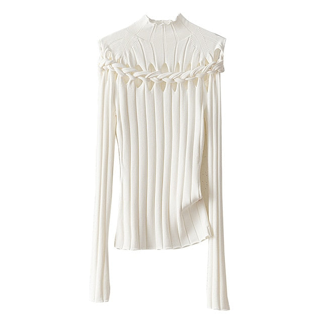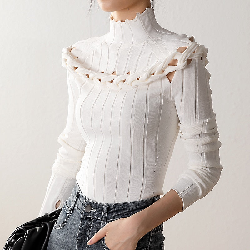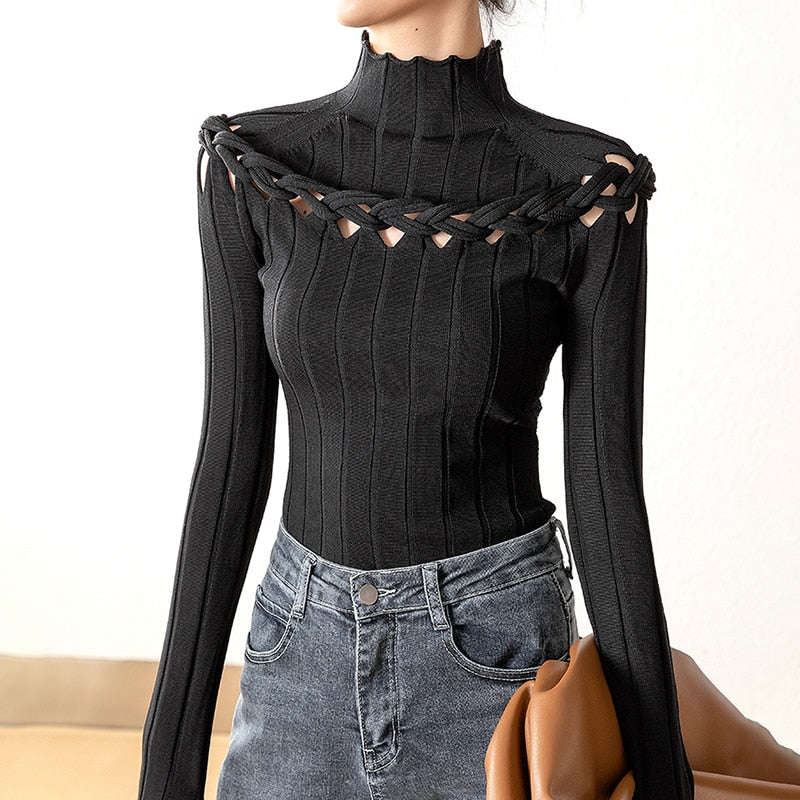Turtleneck Blouse With Solid Pattern, Braided Decoration, Long Sleeve, And Mix Material