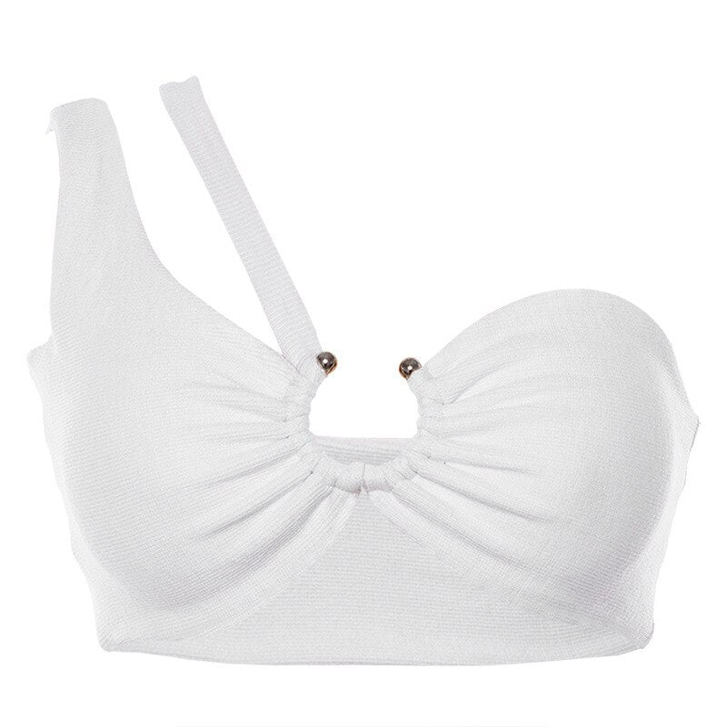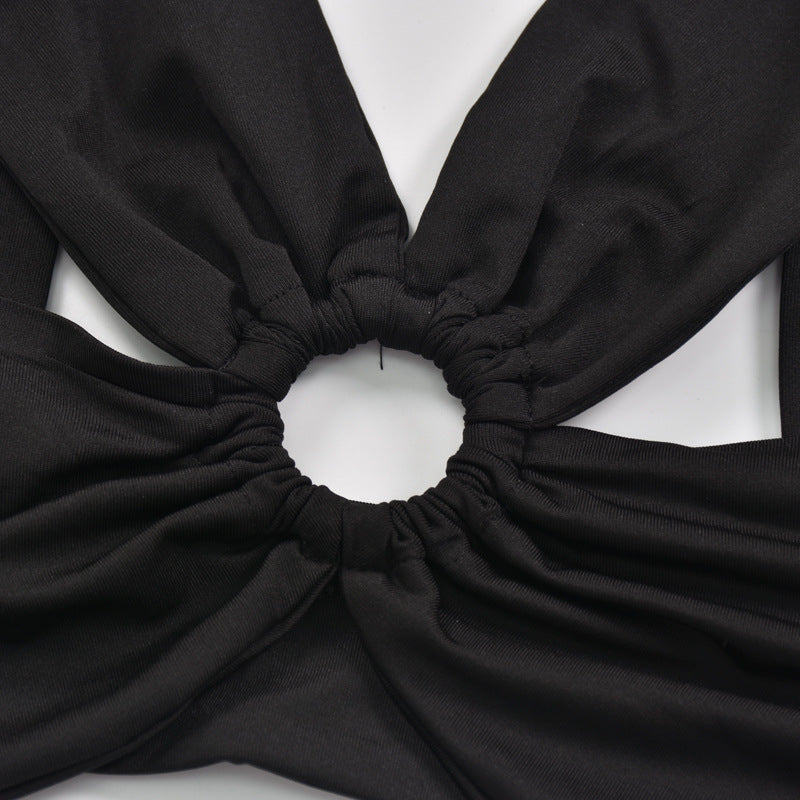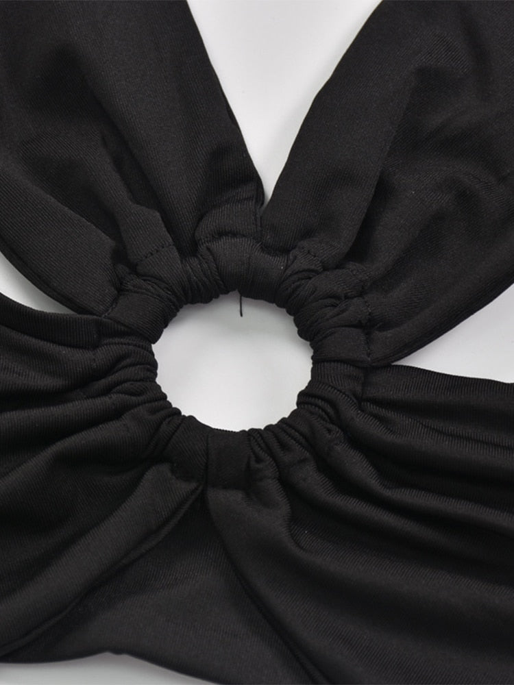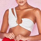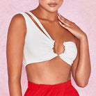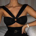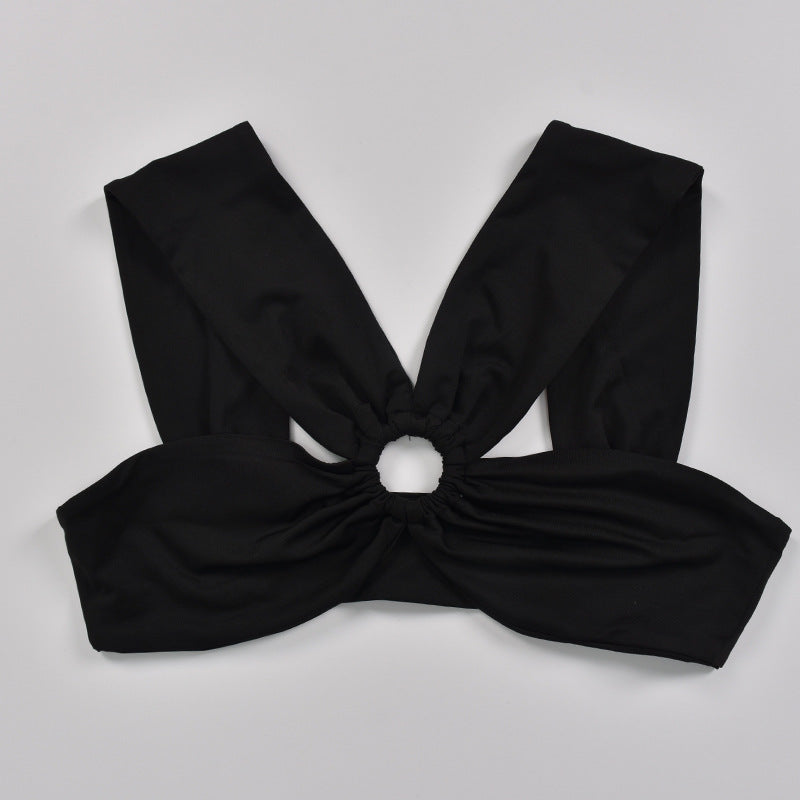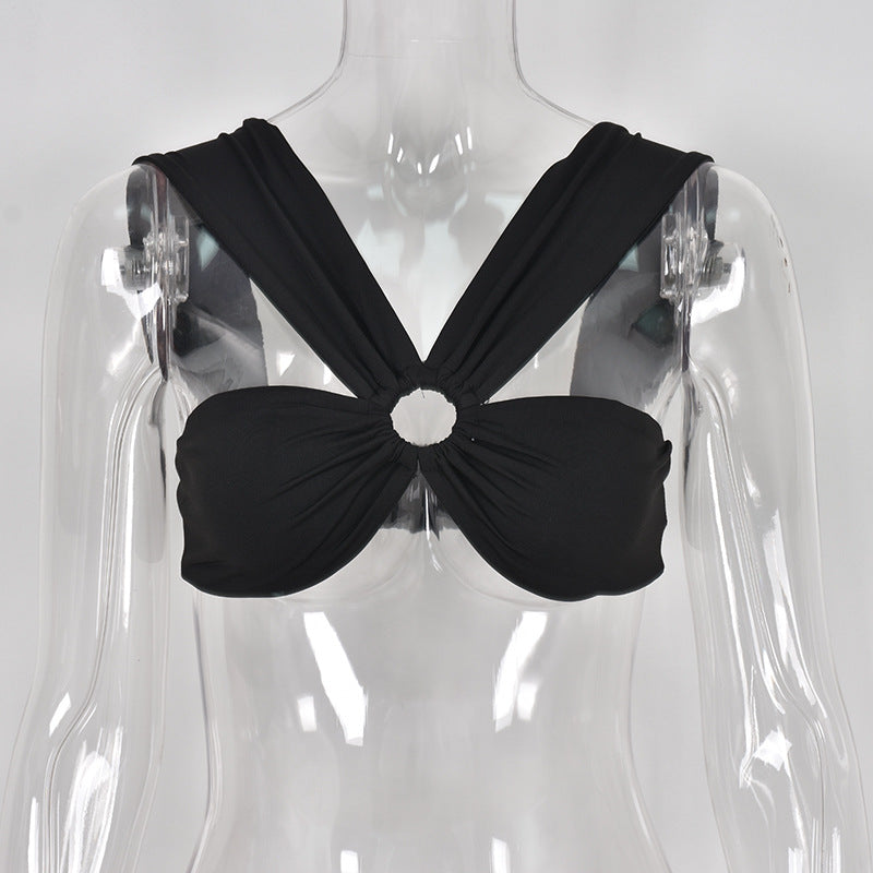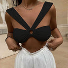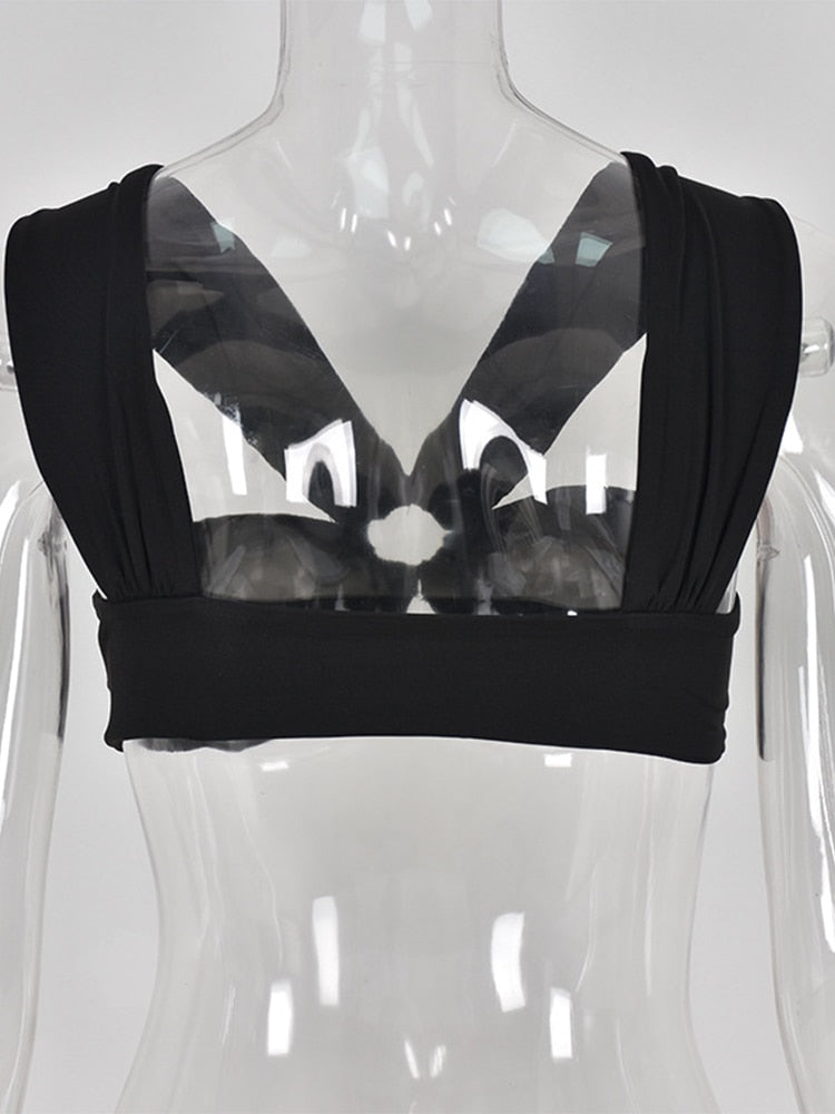 This tank top is made of polyester and is a solid color. It has a hollow-out design. It is designed to be worn with low-cut jeans or shorts. It is available in many different colors and designs.