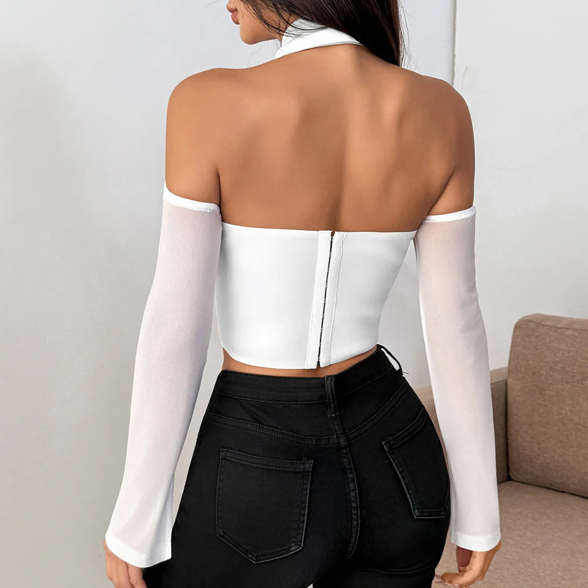 Elevate your style with this striking off-shoulder corset top, designed to turn heads. The sheer mesh sleeves add an alluring touch of sophistication, while the structured corset bodice provides flattering support and definition. Perfect for nights out, special occasions, or when you want to make a bold fashion statement. The delicate mesh detailing balances elegance with edge, creating a versatile piece that works beautifully layered or worn solo.