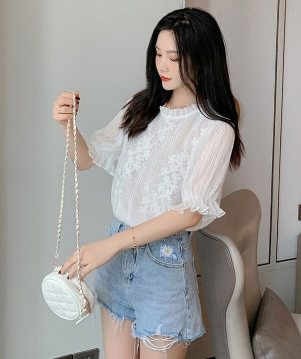This pretty chiffon blouse is the perfect combination of style and comfort. The simple yet feminine floral pattern will look great with anything from jeans to skirts. The short sleeves are perfect for those hot summer days and the soft chiffon material is the perfect choice for all-day comfort.