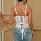 Delicate white lace meets sheer mesh in this elegant bustier, designed to flatter and enhance. The intricate lace detailing creates a romantic silhouette while the breathable mesh fabric ensures comfort throughout the day. Perfect for layering under sheer tops or wearing as a statement piece. The structured bustier design provides gentle support and a polished look for any occasion.