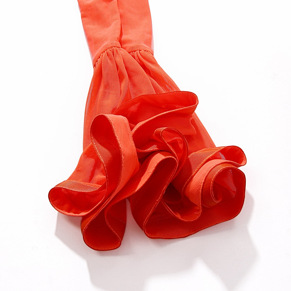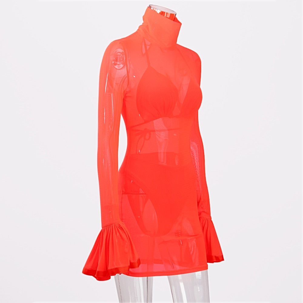 Sheer Mini Dress with Flare Sleeve, Solid Pattern, Sheath Silhouette, Stand Neckline, and Polyester Material