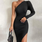 Fashionable and versatile, this dress is a fun and fashionable way to complete any outfit. It is made of polyester spandex. It has a one-long sleeve style that shows off her shoulder. The stunning knitted basic color will look great with any skin tone.