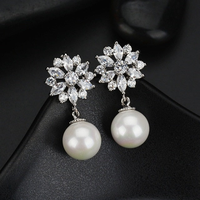 Austrian Imitation Pearl Snow Flower Bridal CZ Stud Earrings