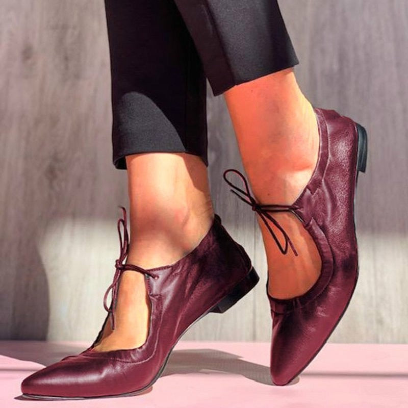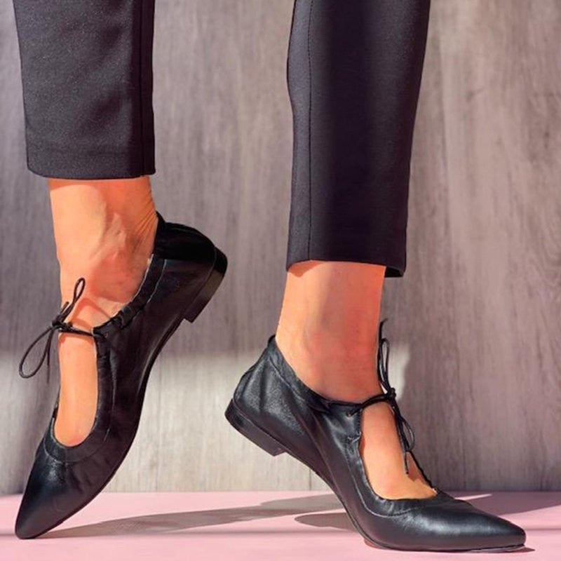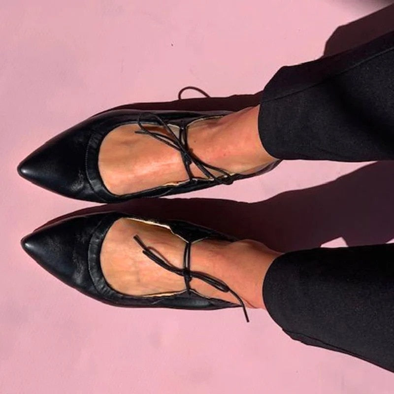 Wear these cute flat shoes on an active day out. The pointed toe combined with the little front lace makes these shoes a unique yet stylish option for daily wear. Skirt or pants, it doesn't matter. It will match any outfit with its solid color. Add this to your collection and it will be an instant favorite.