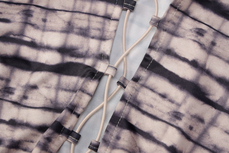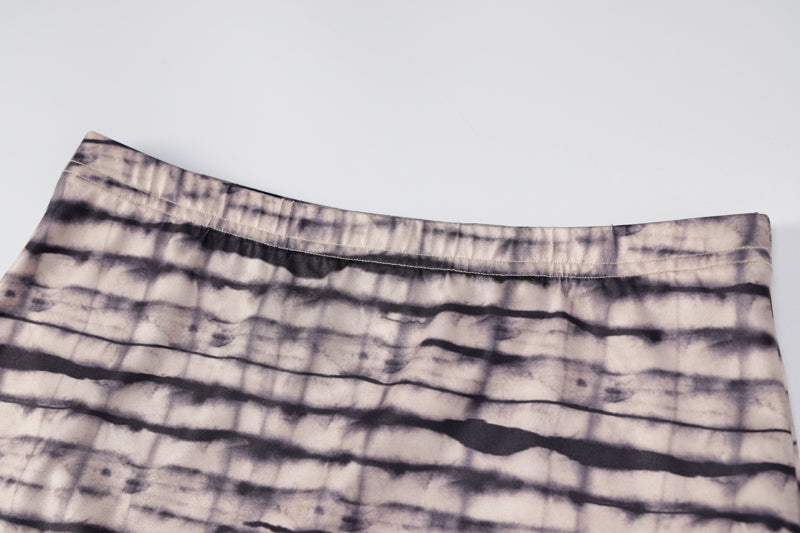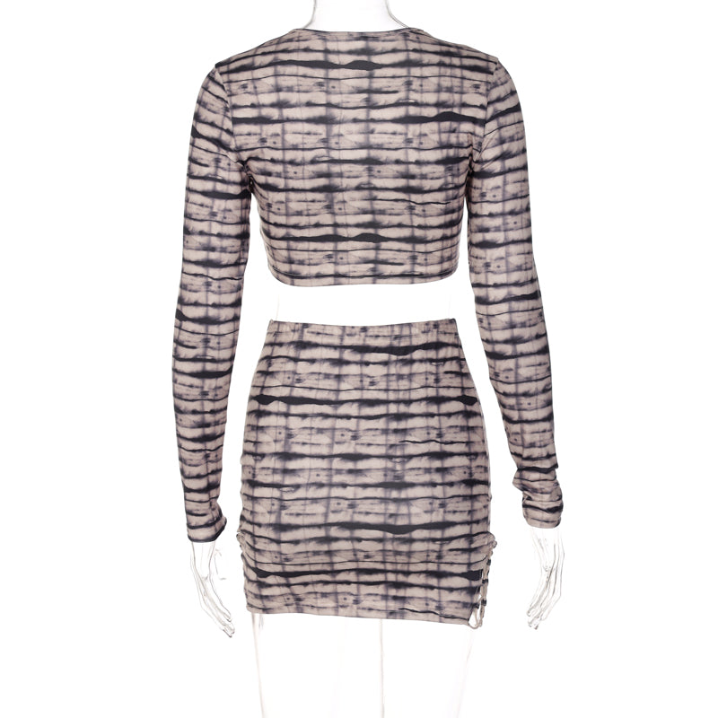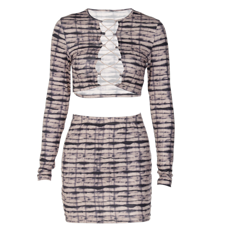This skirt set includes a crop top and a mini skirt. The crop top is made of spandex and features a hollow-out detail. The mini skirt is made of spandex and has an elastic waist. The skirt and top are printed with a geometric pattern.