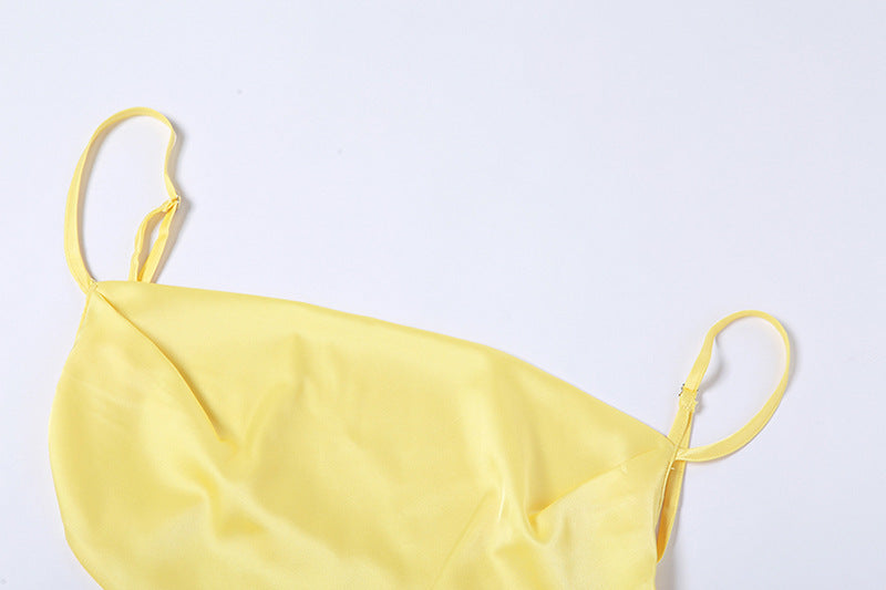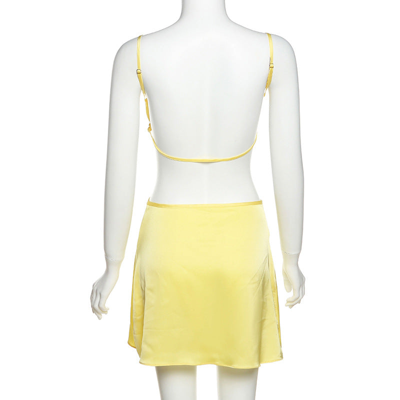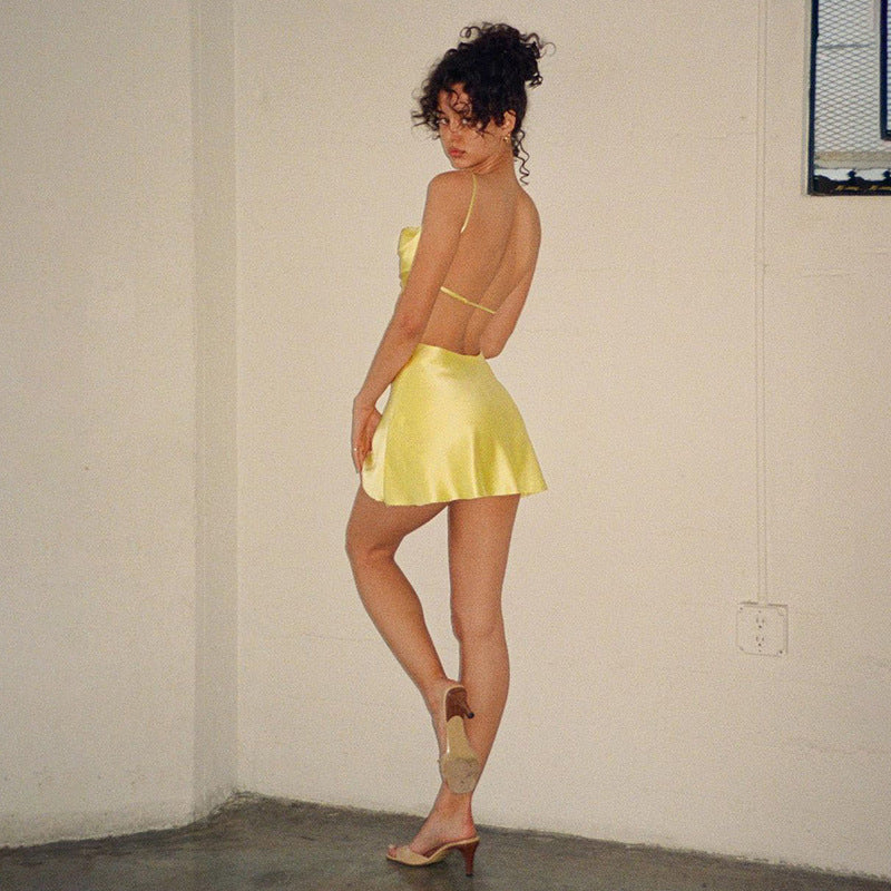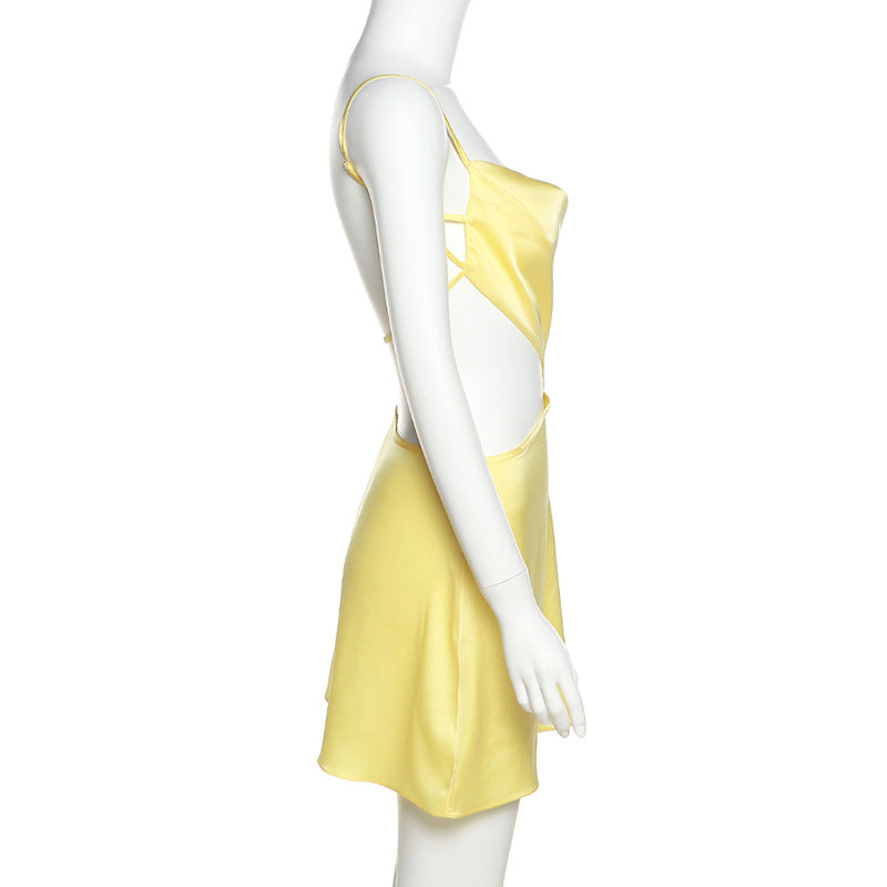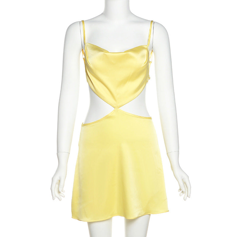 The perfect mini dress for a night out! The solid satin dress has spaghetti straps and a hollow out at the waist. It has an A-line shape and is just the right length to show off your figure. Pair it with some heels and you're ready to go!