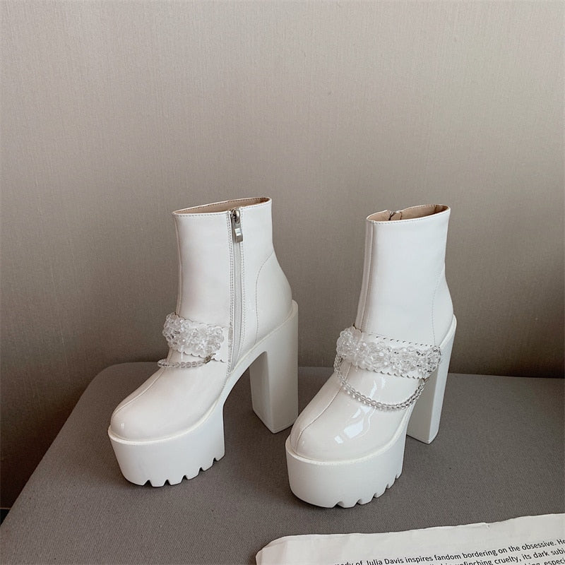 If you want to rock your look, this pair of heeled boots are the perfect finishing touch. The stylish platform and bead detailing upper line the fashion-forward nature of the boot. Designed with a simple round toe and a square heel, this versatile style is also available in black and white colors.