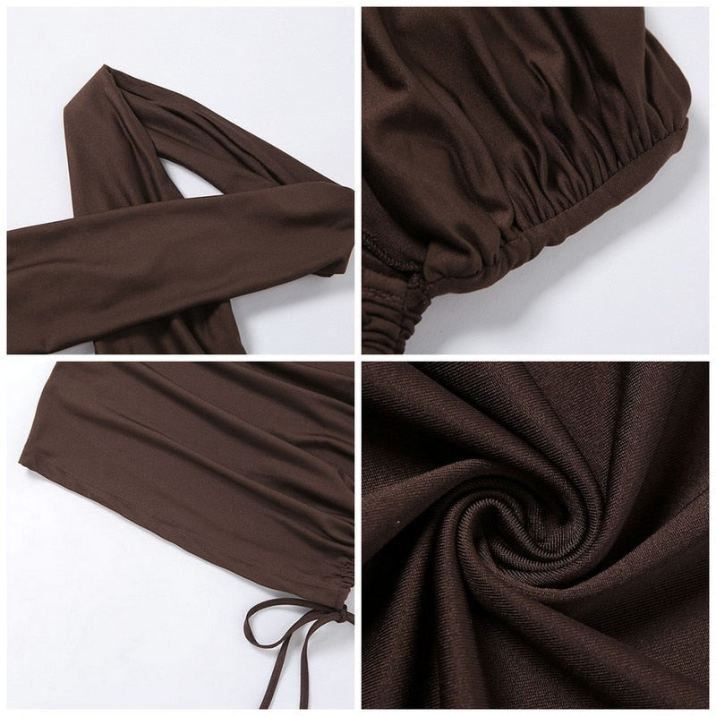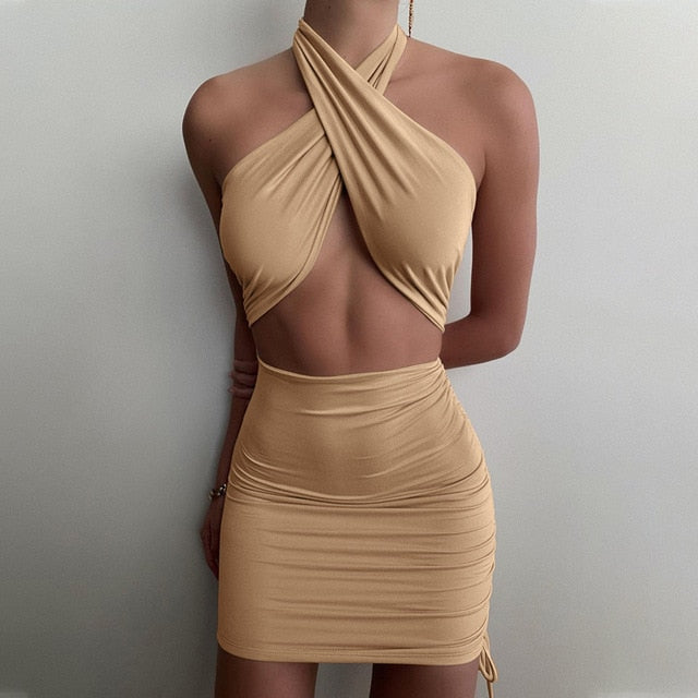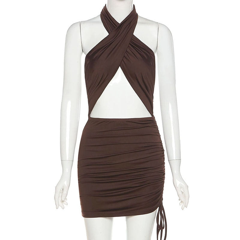 Cut Out Solid Mini Dress with Halter Neckline and Ruched Drawstring Decoration
