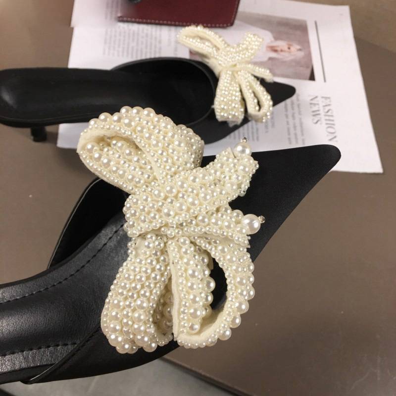 Solid Patterned PU Silk Heeled Mules with Beaded Bows Decoration