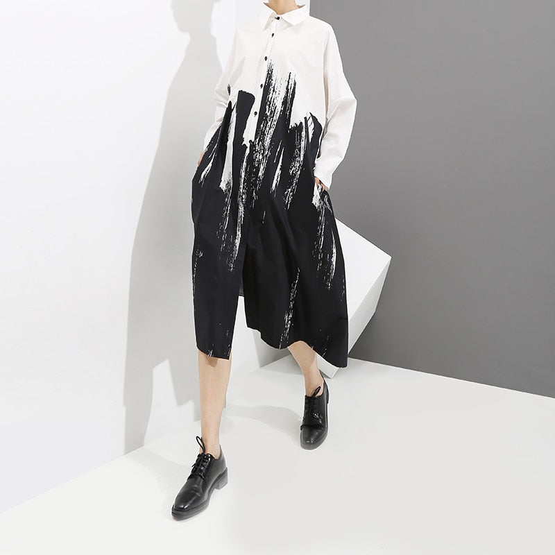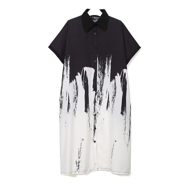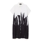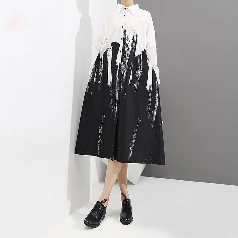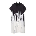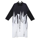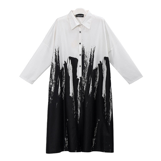 Cotton Acetate Turn-Down Collar Print Pattern Loose Midi Dress