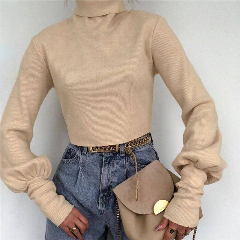 Solid Knitted Sweater with Turtleneck Collar, Long Sleeve, and Cotton Material