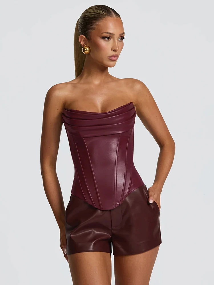 Elevate your style with this striking faux leather bustier, designed with a bold back lace-up detail that adds an edgy, sophisticated touch. The structured bodice provides flattering support and a defined silhouette, while the faux leather material offers durability and easy care. Perfect for making a statement at nights out, special events, or layering over your favorite pieces. Versatile enough to pair with skirts, pants, or wear as a standalone top for confident, fashion-forward looks.