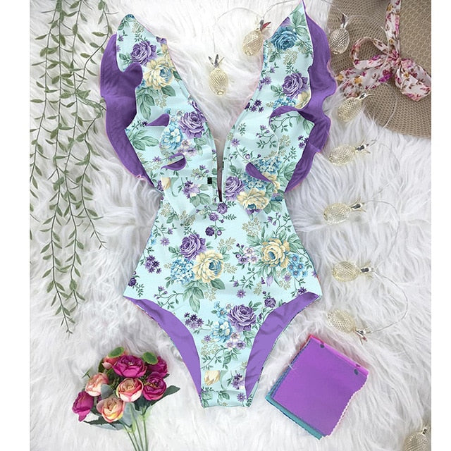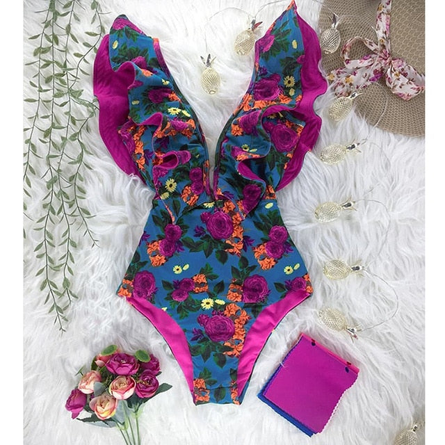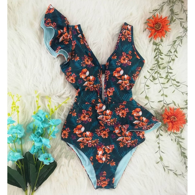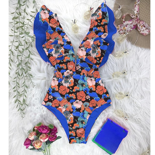 Floral Patterned Butterfly Sleeve One Piece Swimwear with Polyester Material