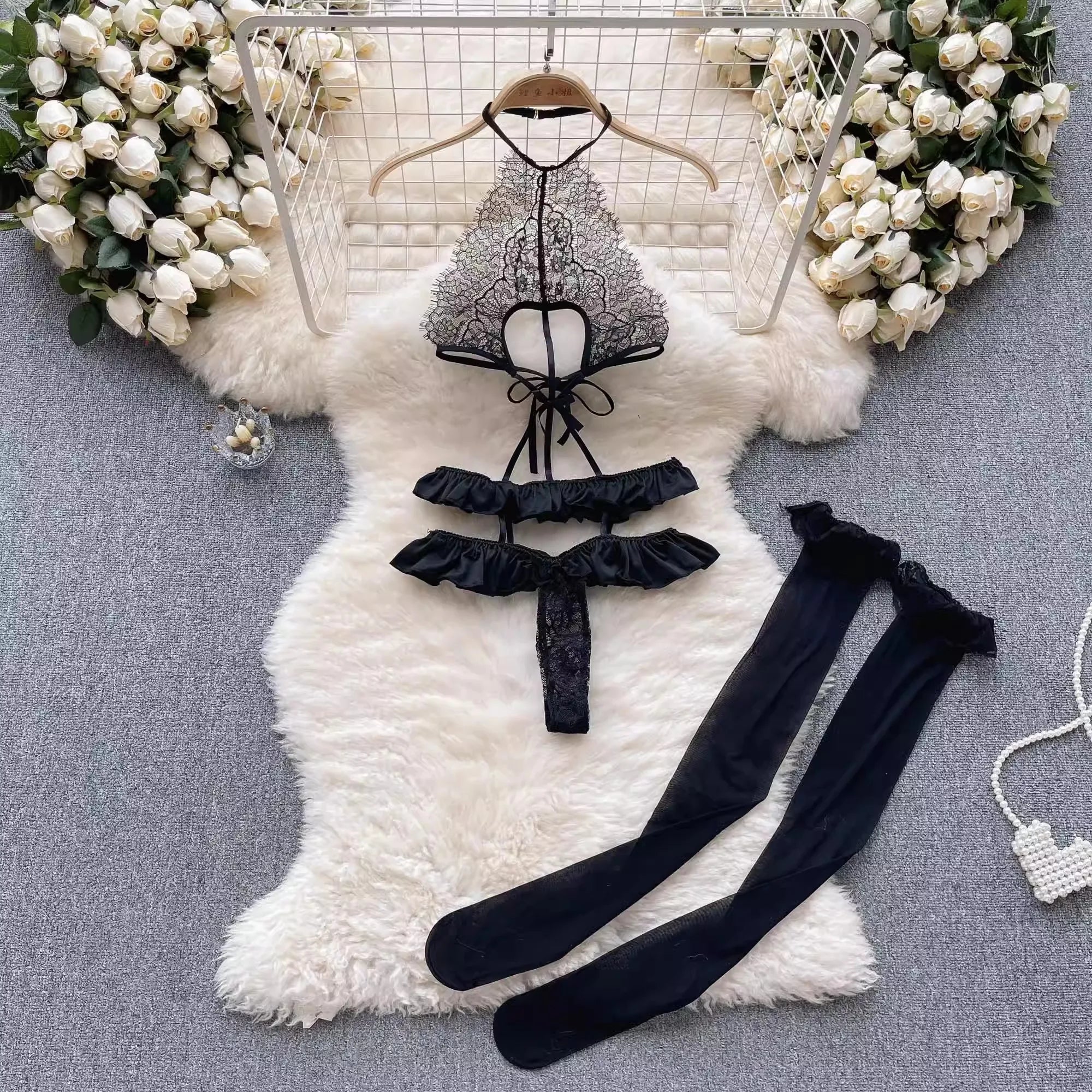 Indulge in the seductive allure of Flaming Fantasy Lingerie. This lace garment boasts a sensual solid pattern crafted from polyester and spandex. Experience superior comfort and exude confidence with each wear!