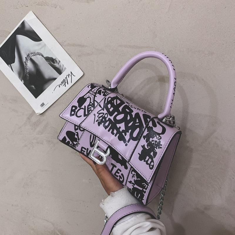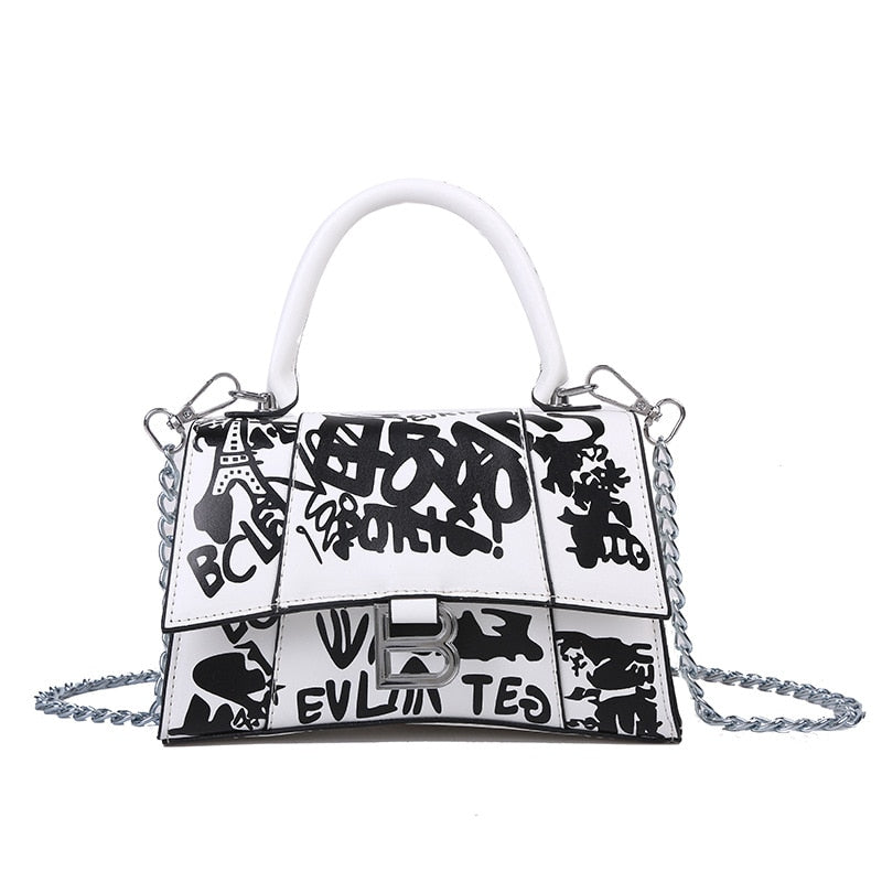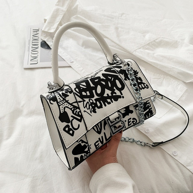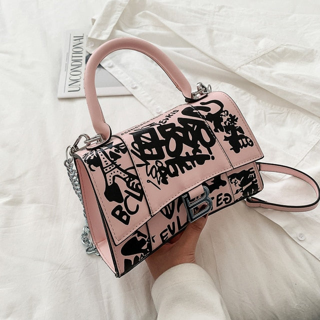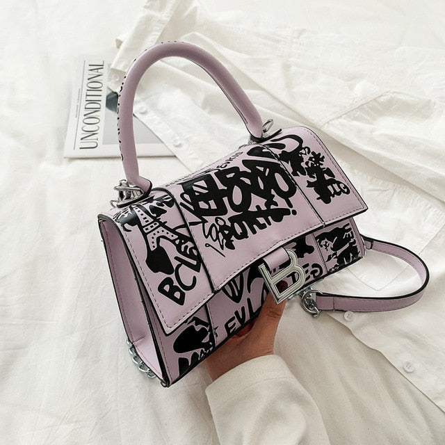 PU Leather Top Handle Bag with Graffiti Pattern and Chain Strap