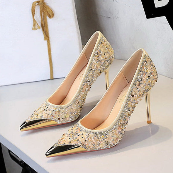 Glitter Affair Stiletto Heels dazzle with sparkling rhinestone patterns on a sleek PU upper. Featuring a sharp pointed toe, these heels offer a striking, fearless look that commands attention at every step.