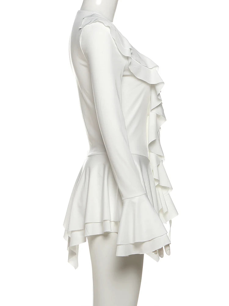 Make a fearless statement with the Harmony in Chaos Mini Dress. Designed with playful ruffles and crafted from a comfortable blend of polyester and spandex, this solid-colored dress hugs your silhouette while adding dynamic movement. It’s the perfect choice for those who embrace bold elegance with a touch of rebellious charm.