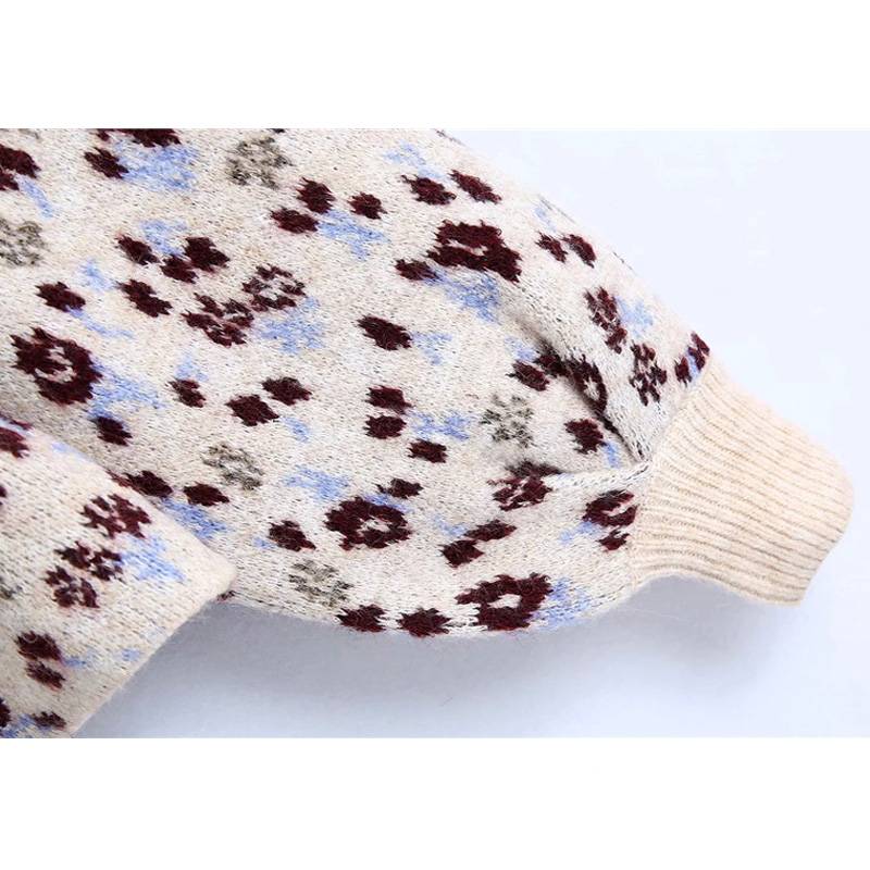 Single-Breasted Sweater with Flower Pattern, O-Neck Collar, Ruffle Decoration, and Polyester Material