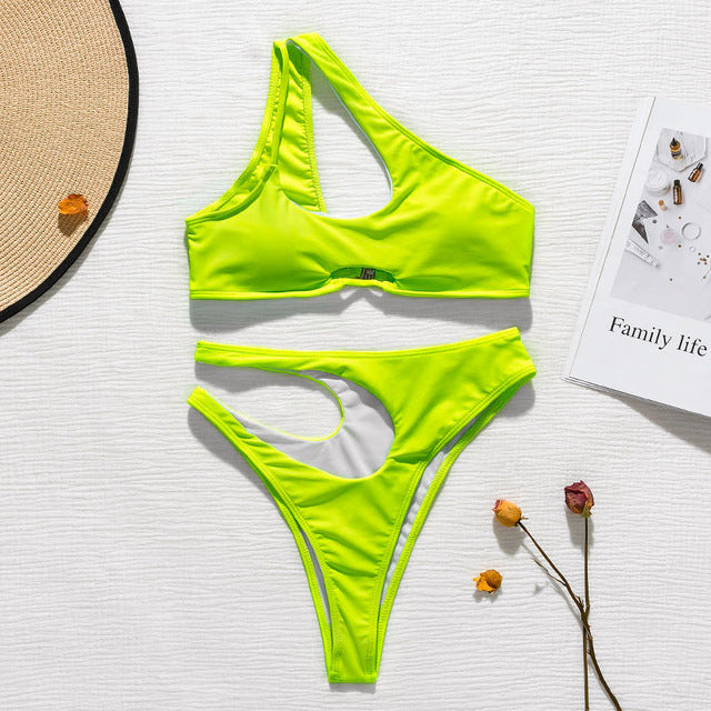 Solid Polyester Spandex One-Shoulder Bikini