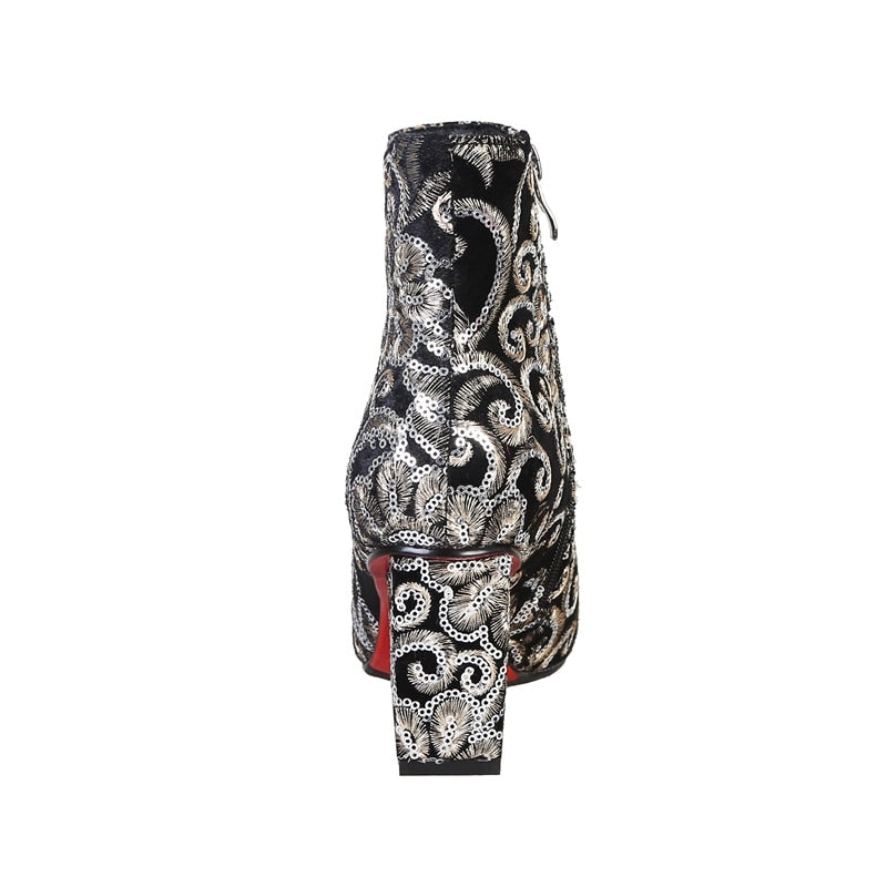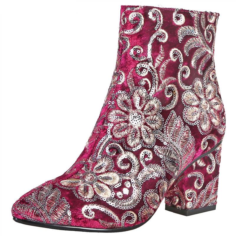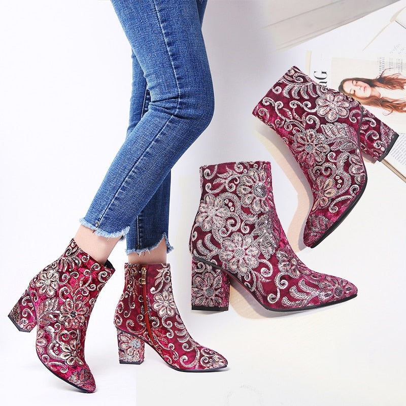Pointed Toe Ankle Boots with Floral Embroidery, Square Heel, Zipper Closure, and Microfiber Upper Material