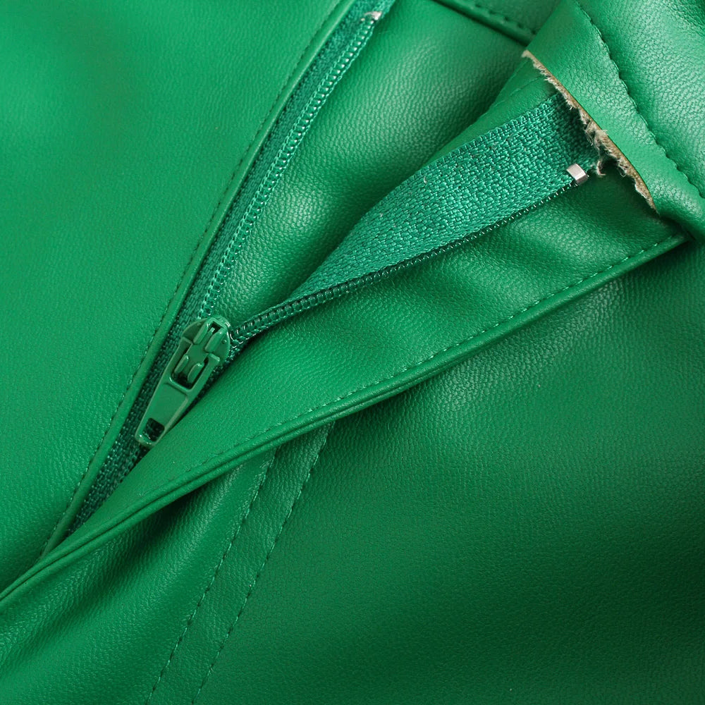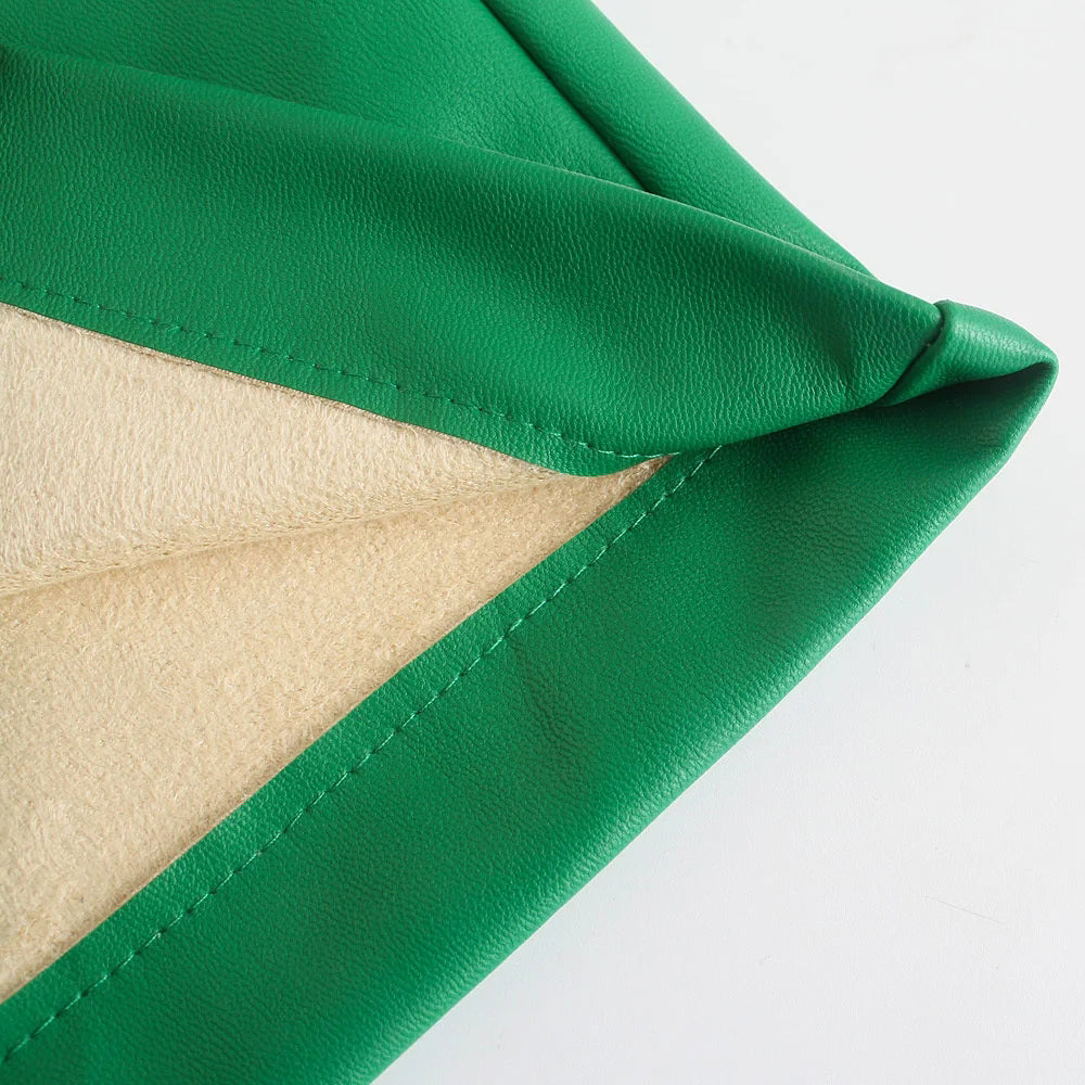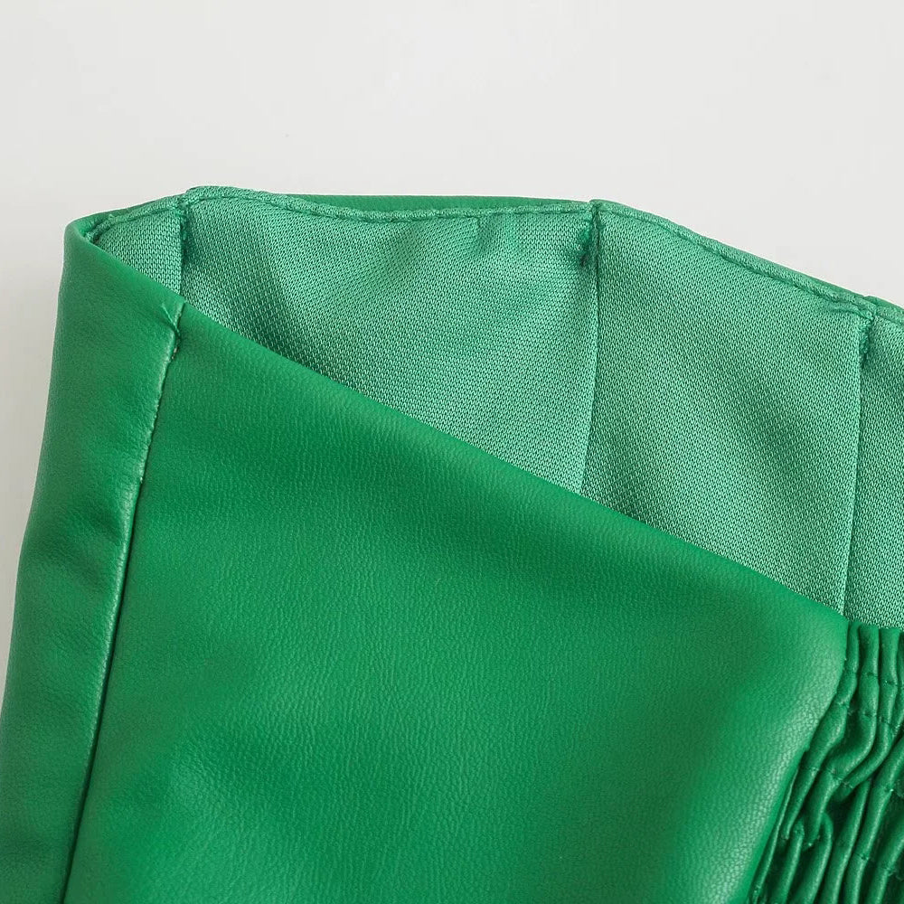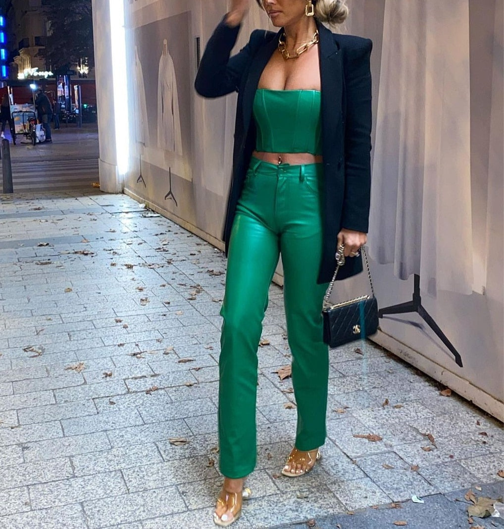 This set of pants is the perfect mix of comfort and style. It includes a long pair of pants with a drawstring waistband and a crop top. These sets are made of leather and polyester and have a solid green color.