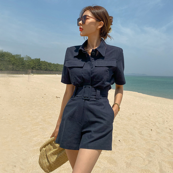 Cotton Polyester Crop Shirts and Shorts Set with Turn-Down Collar and Sashes