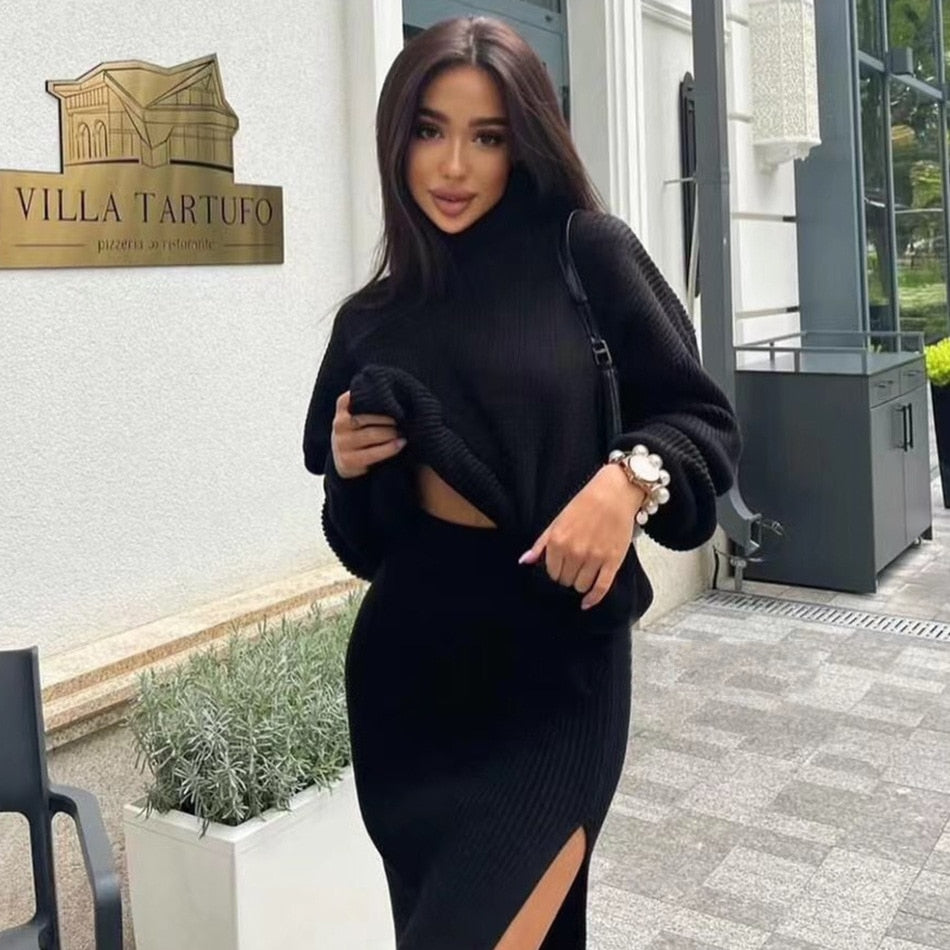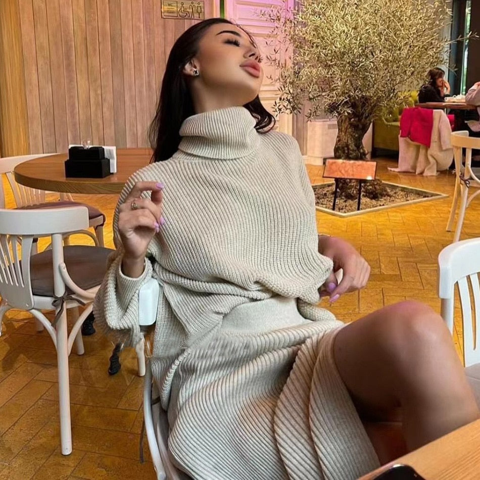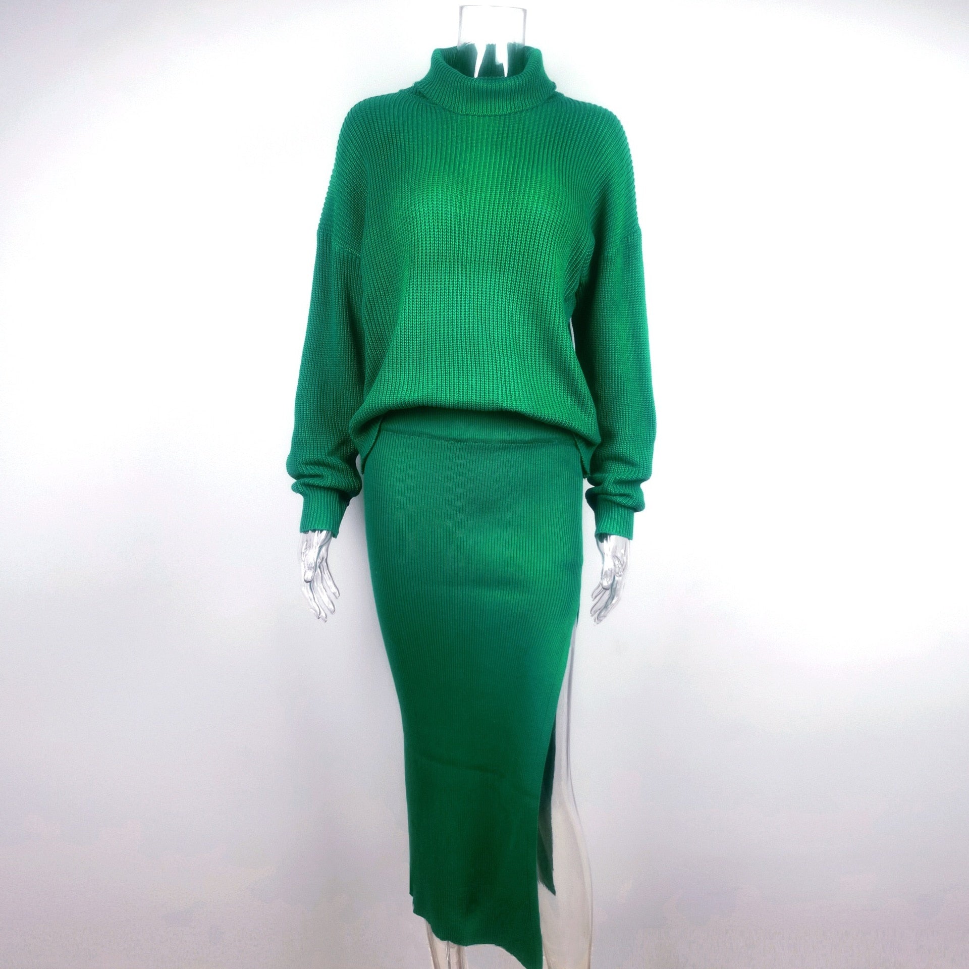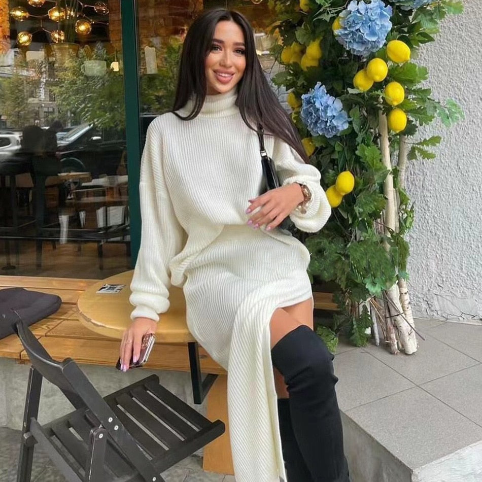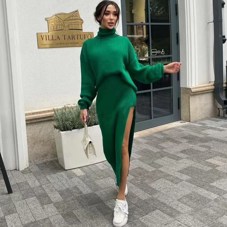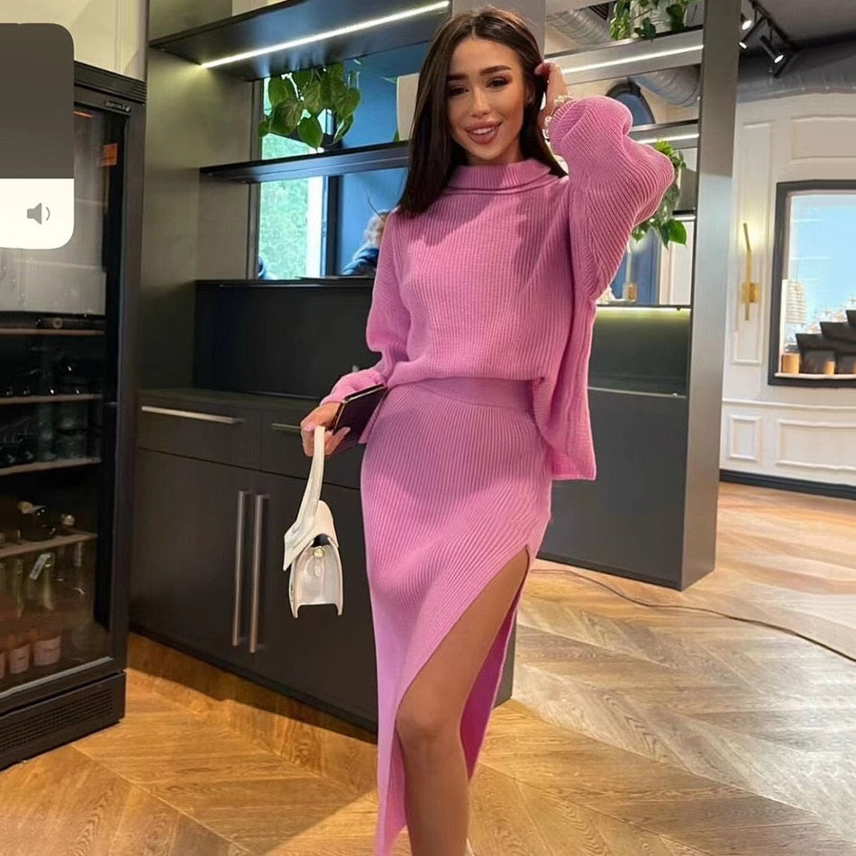 A slitted maxi dress with long sleeves and a turtleneck is perfect for those chilly days. The dress is made of a soft and stretchy knit that is perfect for wearing as a day or night out.