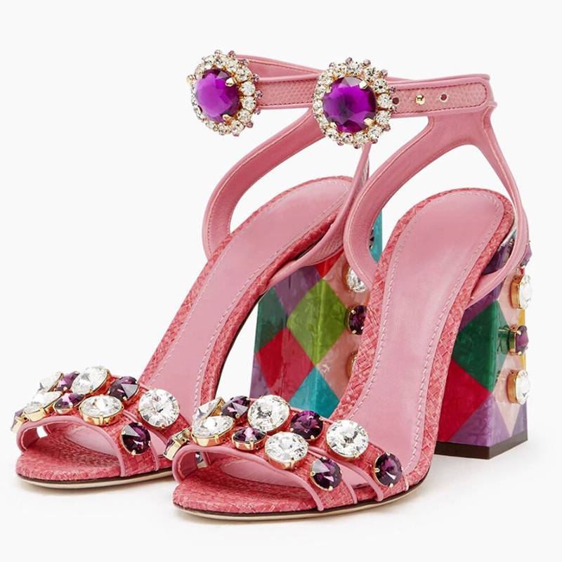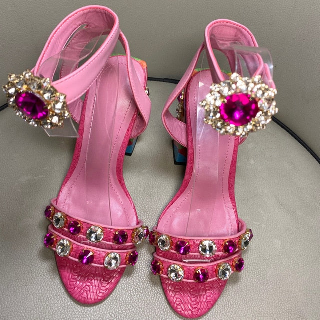Pink Square Heel Sandal with Rhinestone Decoration, Rubber, Buckle Strap Closure, and Sheepskin Material