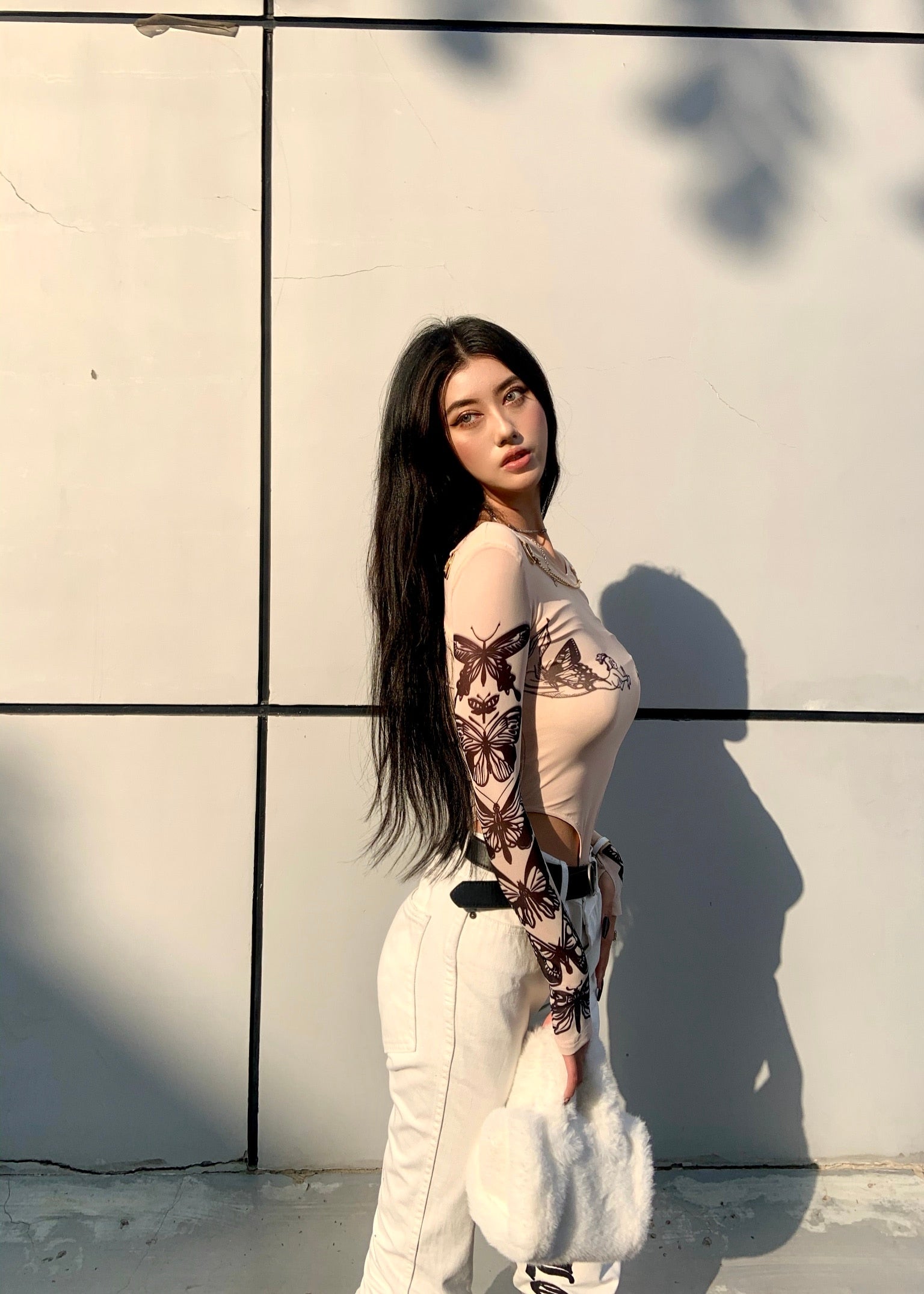 Long-Sleeved Polyester Bodysuit with Butterfly Print and Chain Metal Decoration