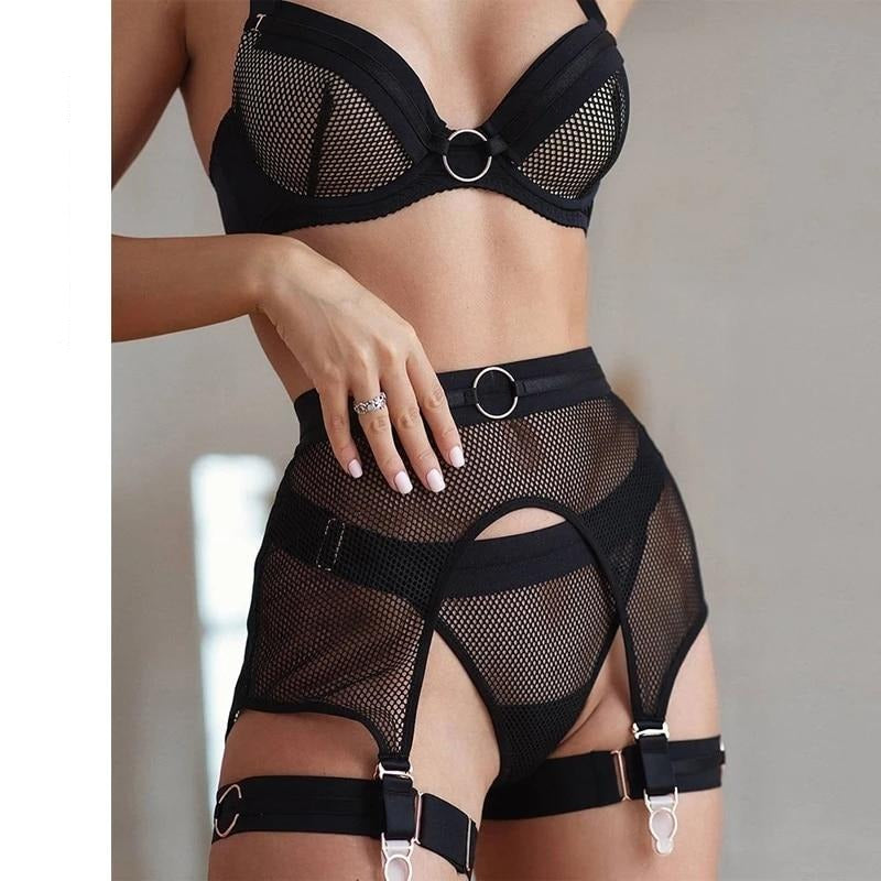 Solid Fishnet Lingerie Sets with Ring Metal Decoration