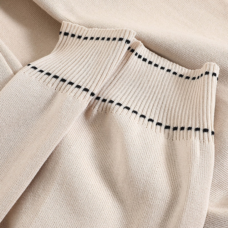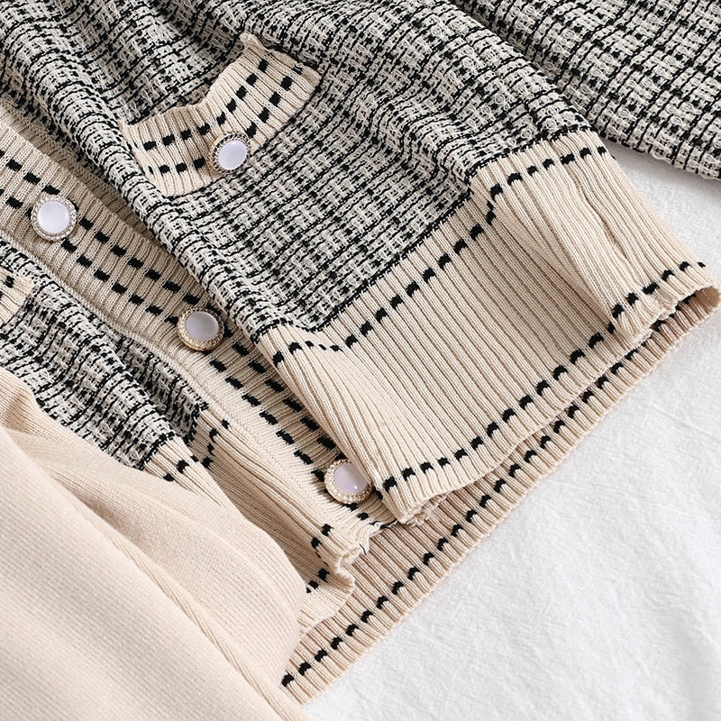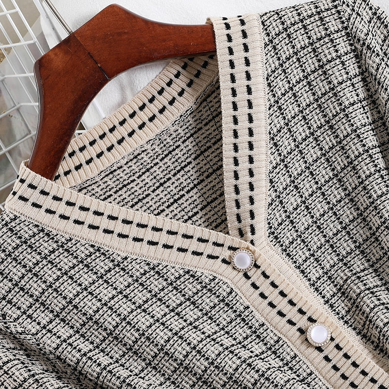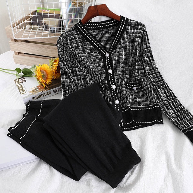 V-Neck Single-Breasted Sweater with Plaid Pattern and Solid Elastic Waist Pant with Acrylic Material