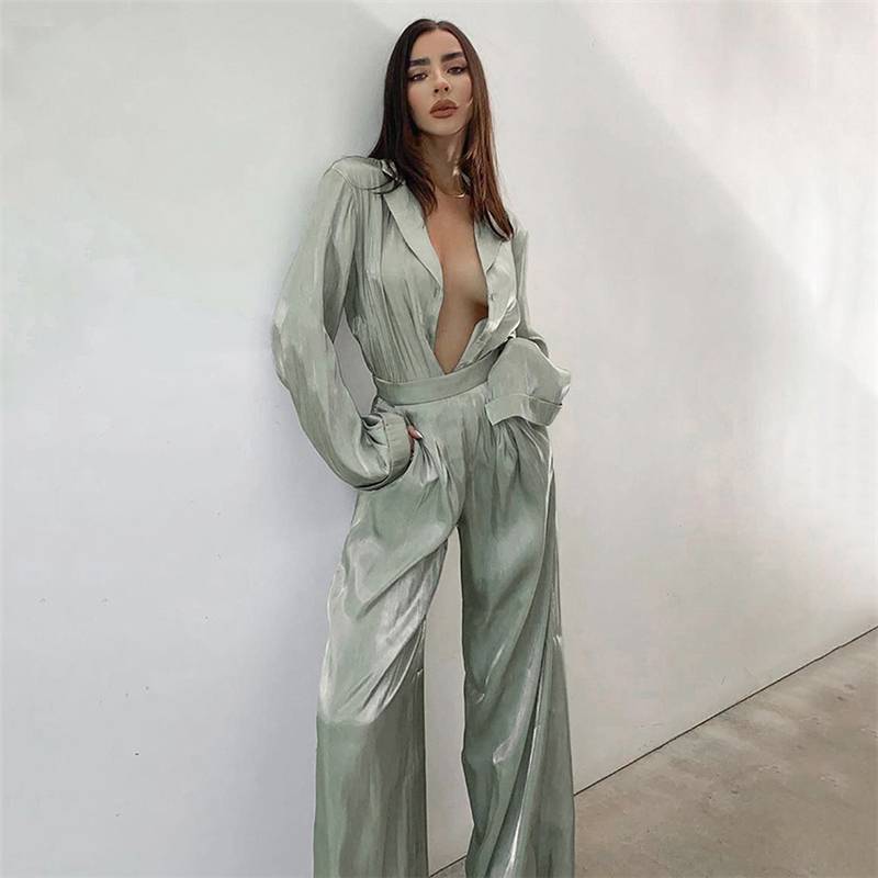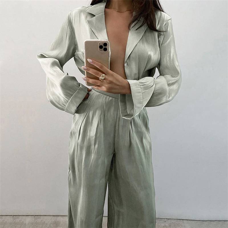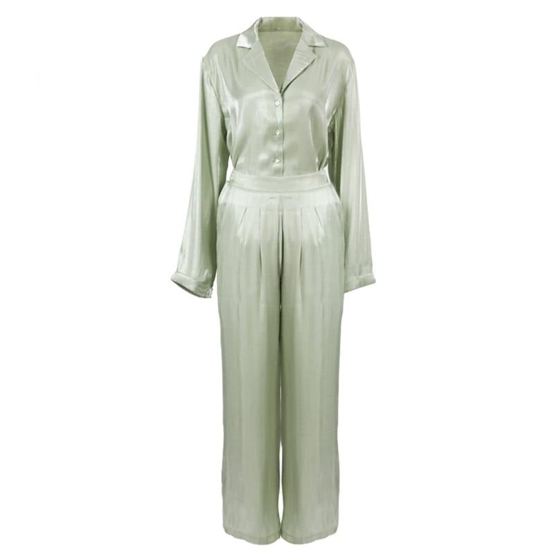 Long-Sleeved Notch Lapel Shirt and Zipper Closure Loose Pant with Silk Cotton Material
