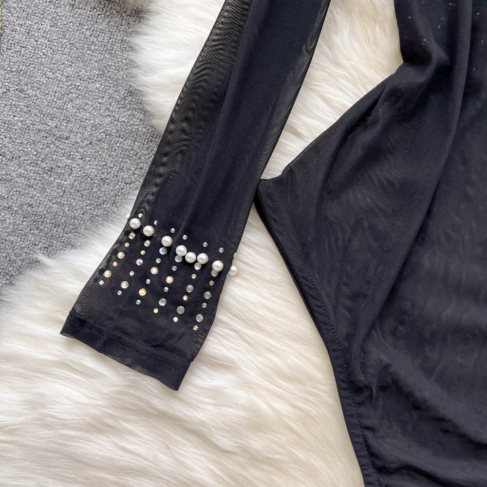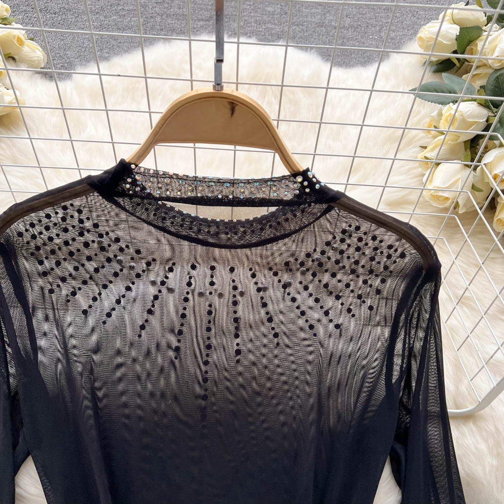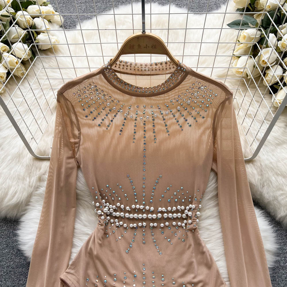 This product is a women's bodysuit with a polyester, mesh, and rhinestone decoration. The long sleeve bodysuit is available in one size, which fits most women. The bodysuit features an o-neck.