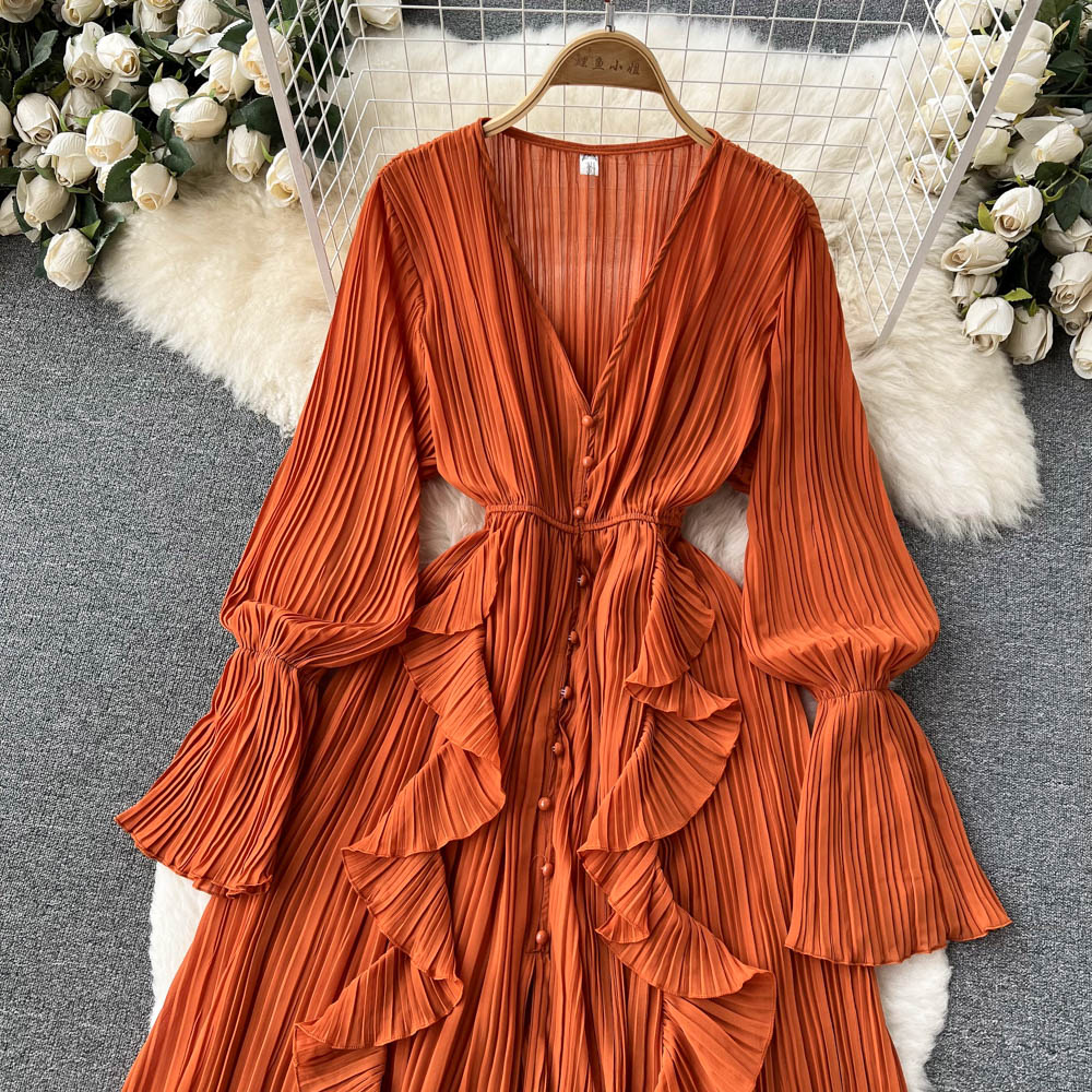 Look at this beautiful maxi dress! This dress is made of polyester, is ankle-length, has ruffles, A-line, lantern sleeve, and v-neck. It is a simple yet flattering design that will make any woman feel comfortable and beautiful.