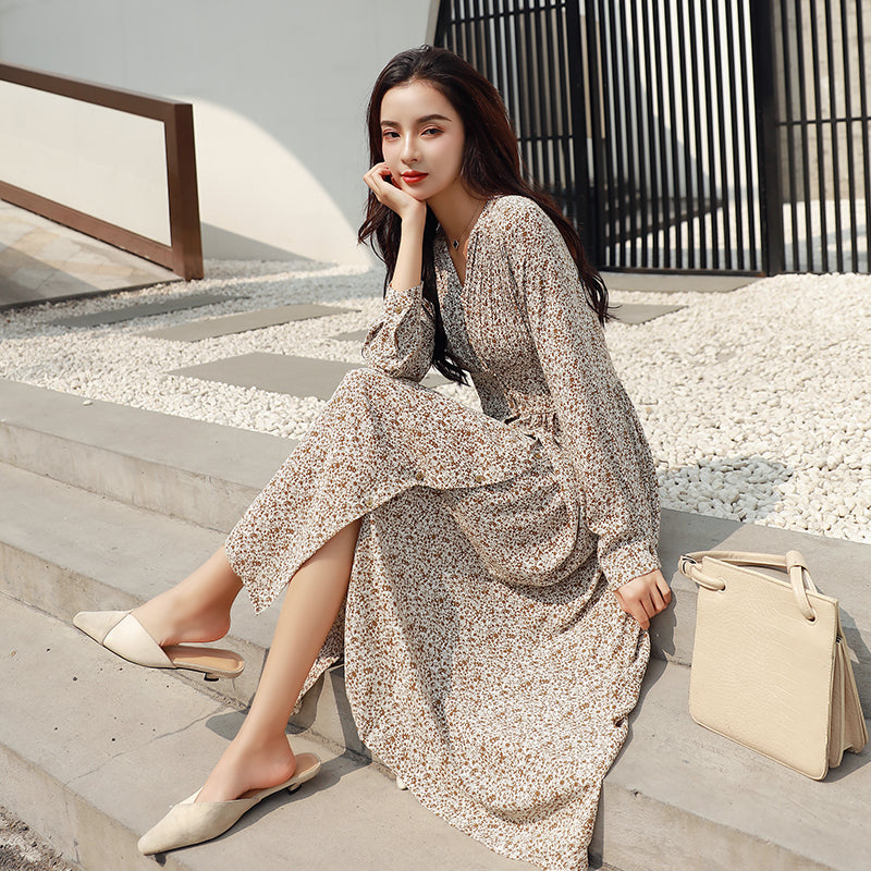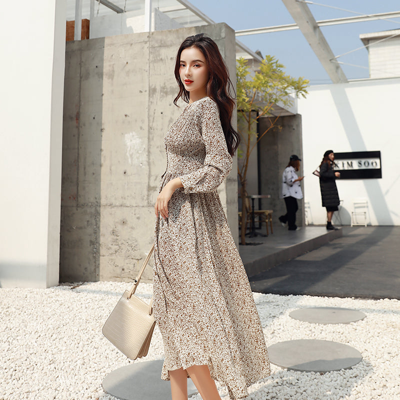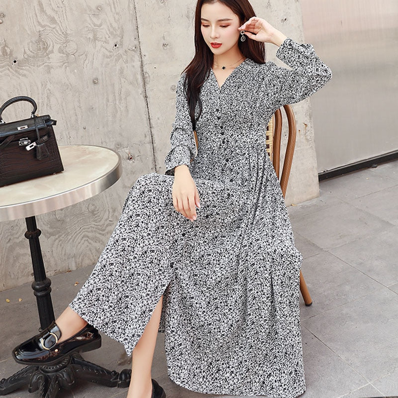 Long-Sleeved Acrylic Chiffon Microfiber Midi Dress with Full Geometric Pattern and Empire Waist