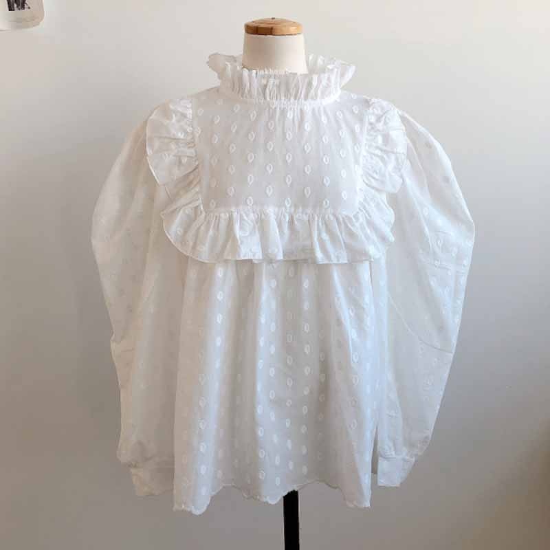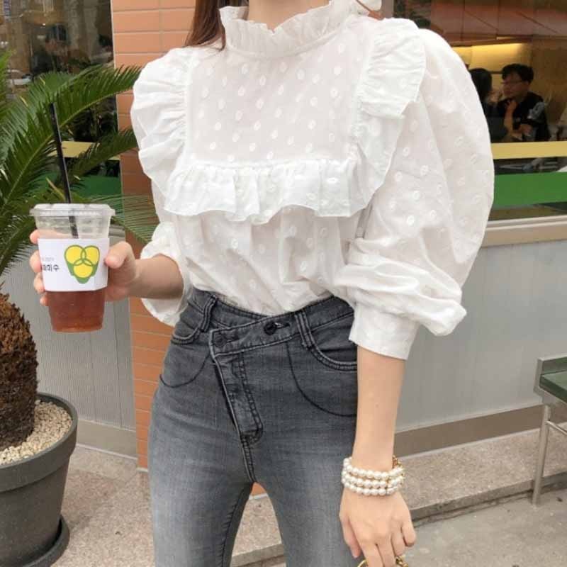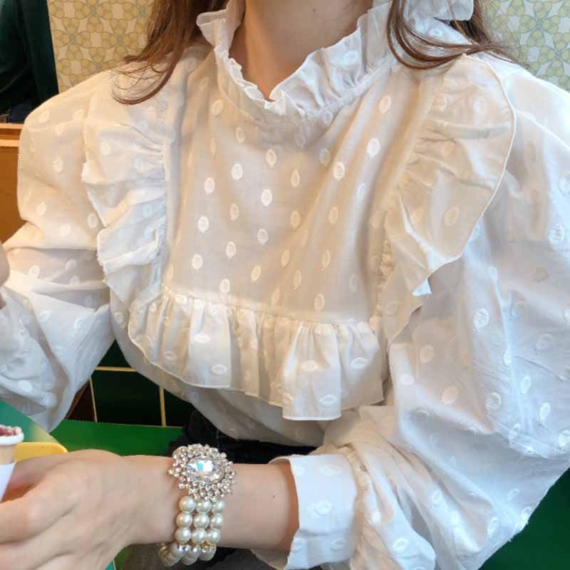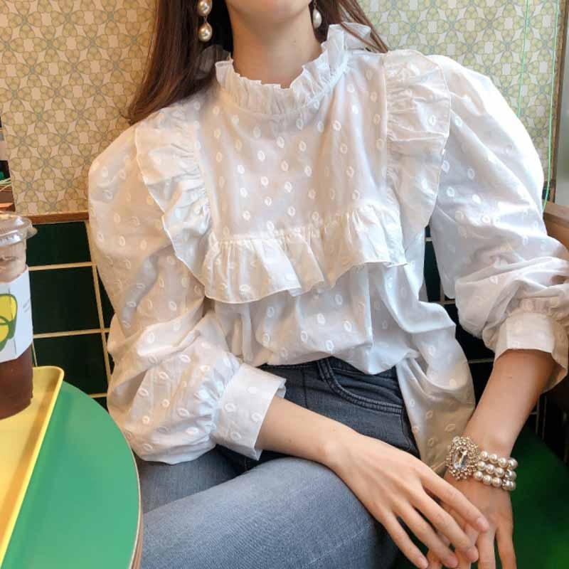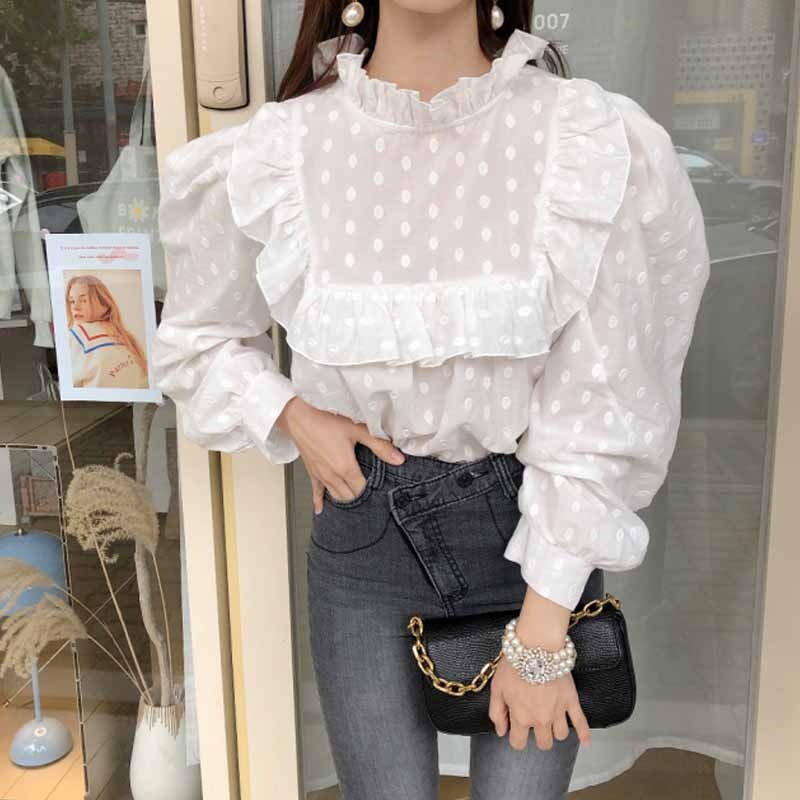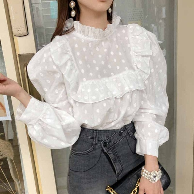Puff Sleeve Cotton Blouse with Polka Dot Pattern, Solid Color, Ruffle Decoration, and Broadcloth Fabric Type