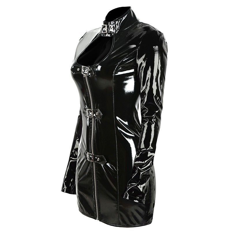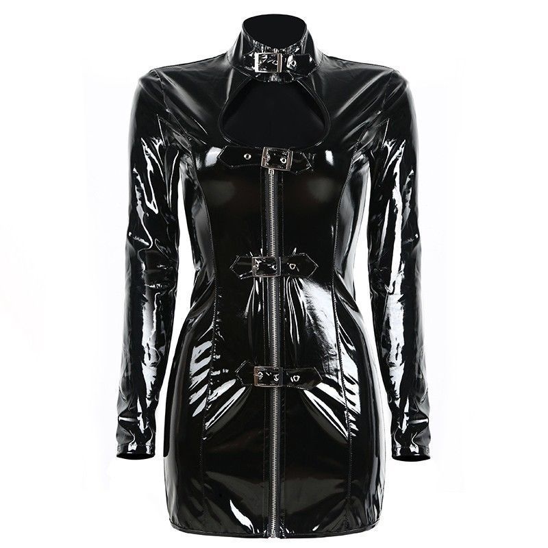 This long-sleeved midi dress is designed to be a part of your everyday wardrobe. It's made from a lightweight PVC material, giving it a stylish and sophisticated look. The turtleneck collar is a chic detail that keeps cool during the warmer months. The buckle strap adds a stylish, feminine accent and can be worn with a variety of different pants