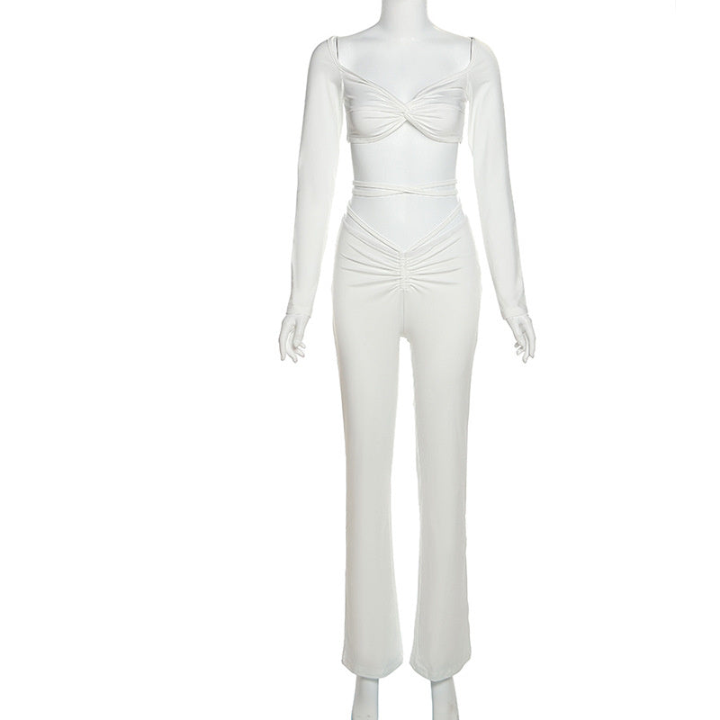 This pants set will keep you looking stylish while still being active. Made from spandex material, it is very easy and comfortable to wear. It features off-shoulder long sleeves with a sweetheart neckline and waist lace style. The ruched front also gives a simple accent to the basic full-length pants.