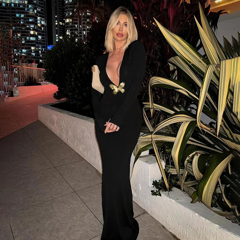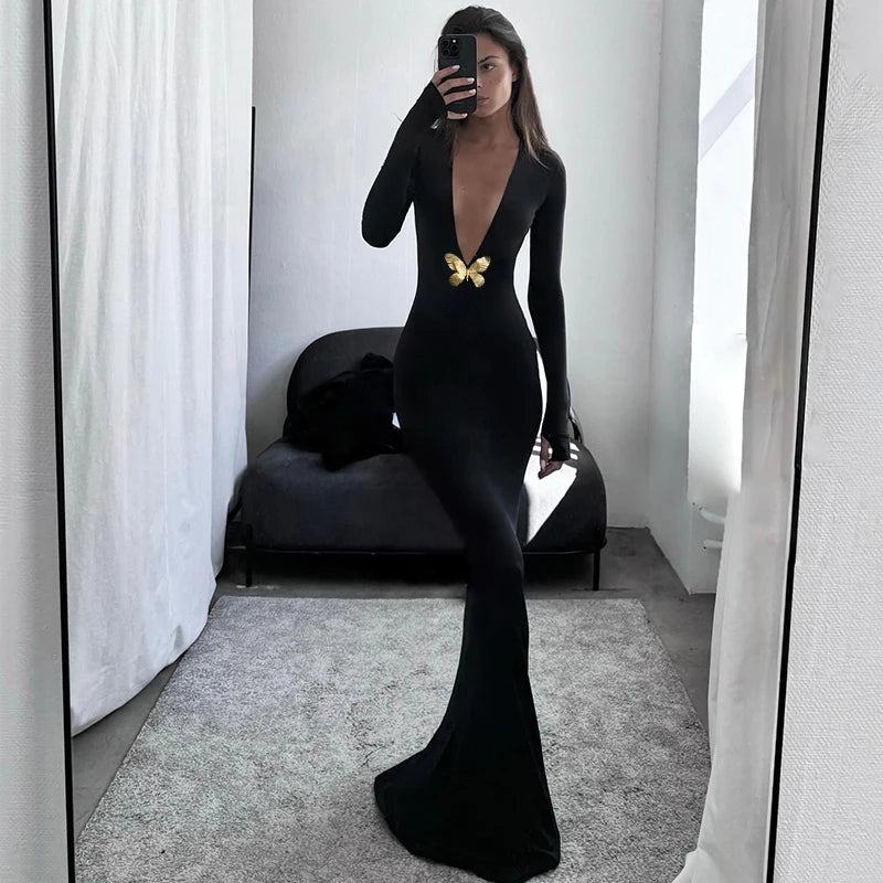 Elevate your style with The Golden Year Long Dress. Its trumpet/mermaid silhouette and V-neckline create a sexy & club look, while the appliques add a touch of elegance. Made from cotton and polyester, this floor-length dress is perfect for any occasion. Step out in confidence and turn heads with this must-have piece.