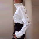 Experience the ultimate in comfort and style with our Utopian Pulse Blouse. The uniquely designed skew collar adds a touch of elegance, while the buttons allow for versatile styling. Made with a slight stretch of polyester, this blouse will keep you looking and feeling your best all day long!