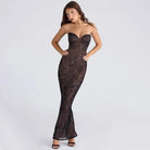 Own the night in the Velvet Espresso Maxi Dress, where bare-shoulder boldness meets intricate allure. This captivating gown features delicate lace layered with polyester for a luxurious blend of texture and movement. The strapless neckline bares your shoulders with unapologetic confidence, while the maxi length commands attention with every stride.