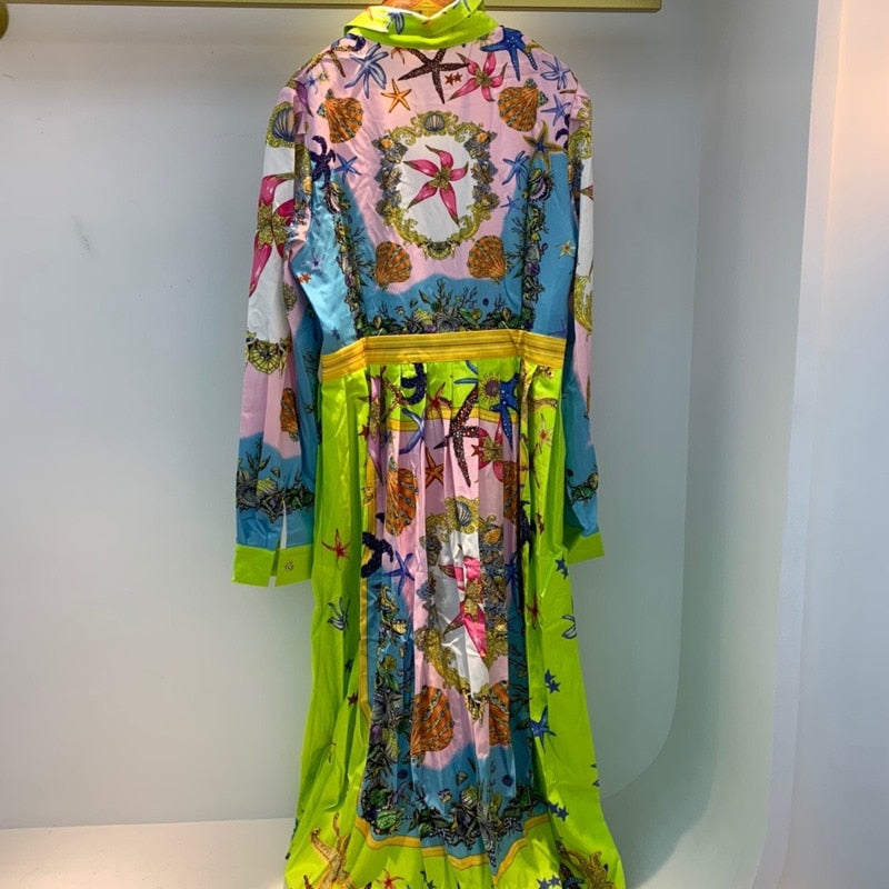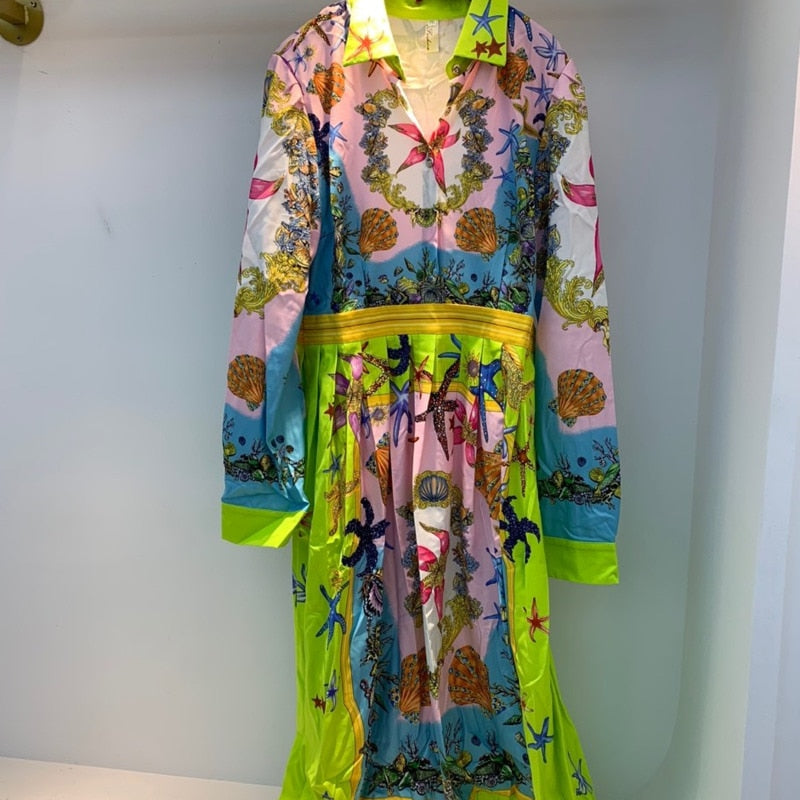 Long Sleeve Turn Down Collared Midi Dress with Print Pattern