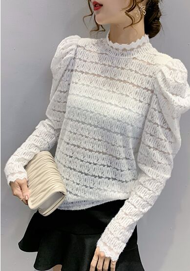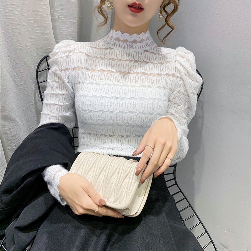 Solid Patterned Lace Tee With Puff Sleeve, Turtleneck Collar, And Cotton Polyester Material