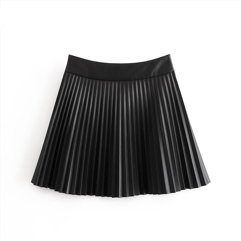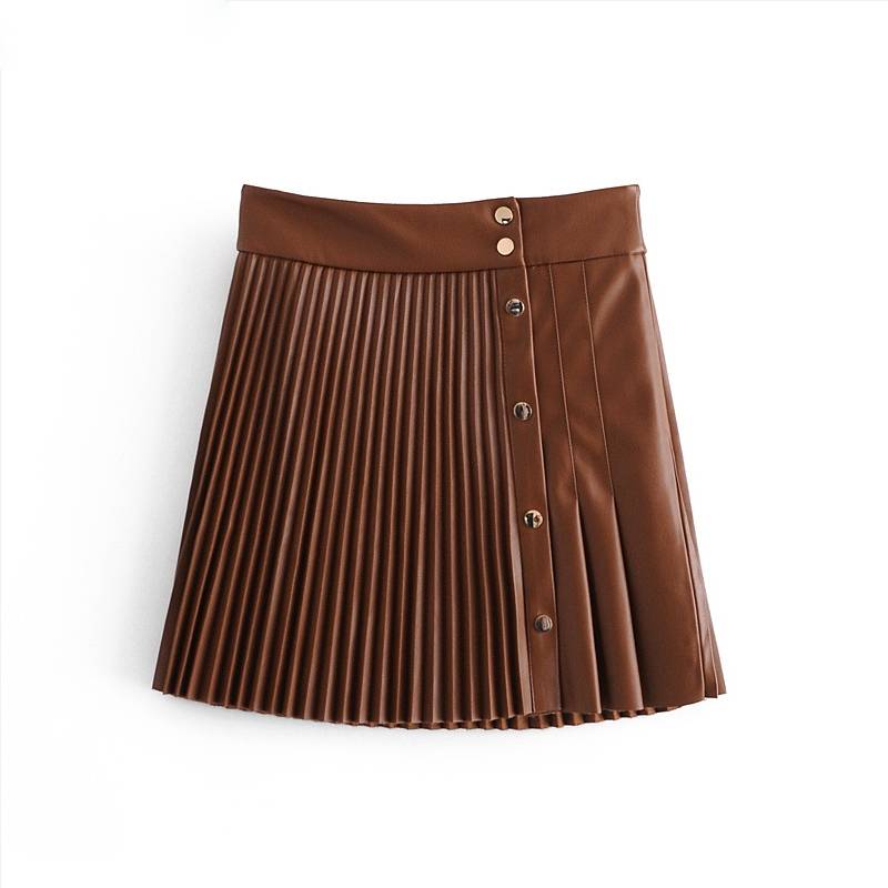 Pleated Solid Mini Skirt with Button Decoration, PU, and Polyester Material