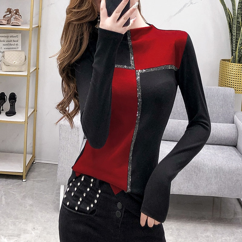 Blusa lisa de manga larga con cuello de tortuga y material de algodón y poliéster