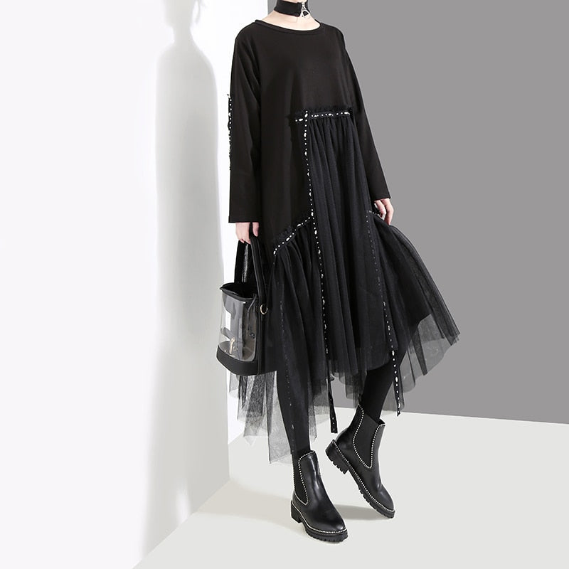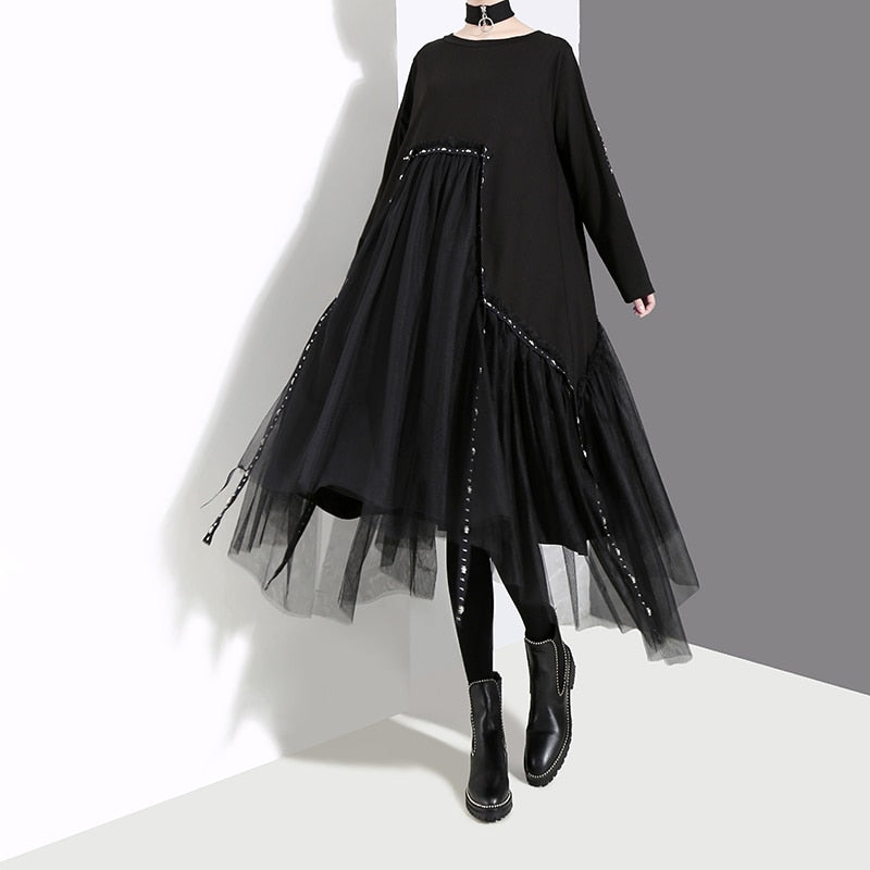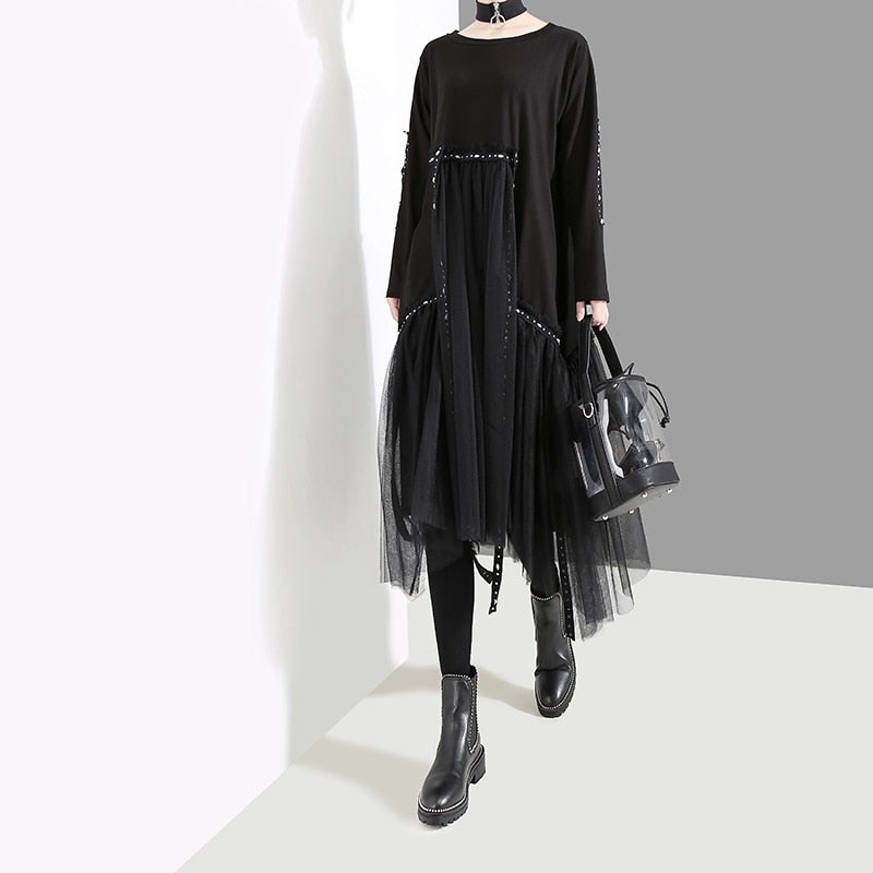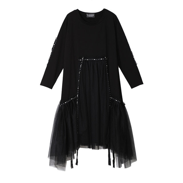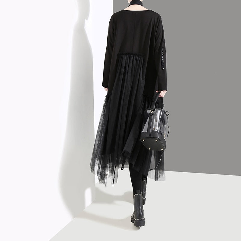 Vestido midi holgado hasta la rodilla con cuello en O de acetato de malla