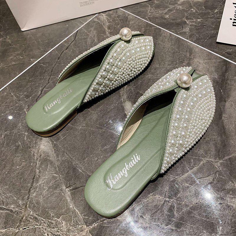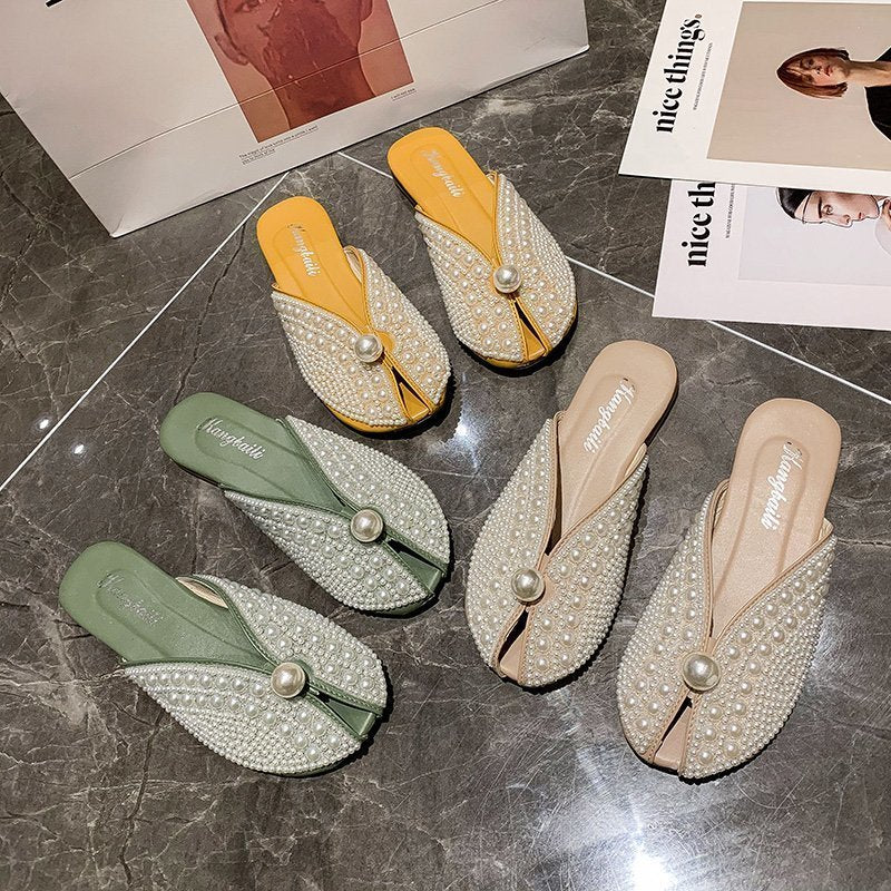 Step out with stylish and elegant style in these trendy slip-on sandals. These feminine and stylish sandals feature a unique design with a pearl beads decoration. These playful and stylish sandals are perfect for a day out and about.