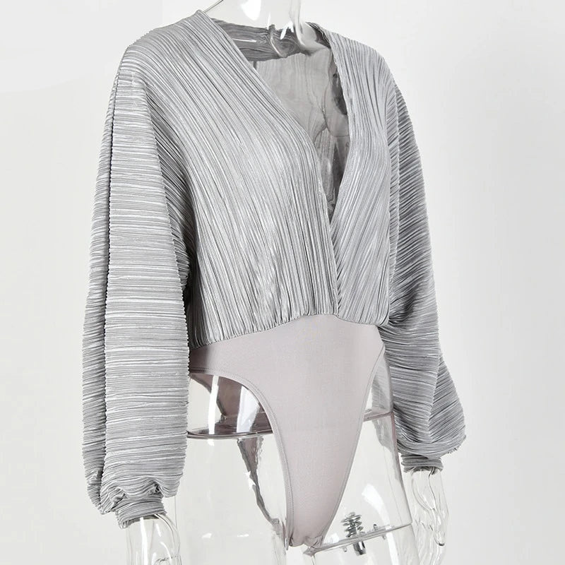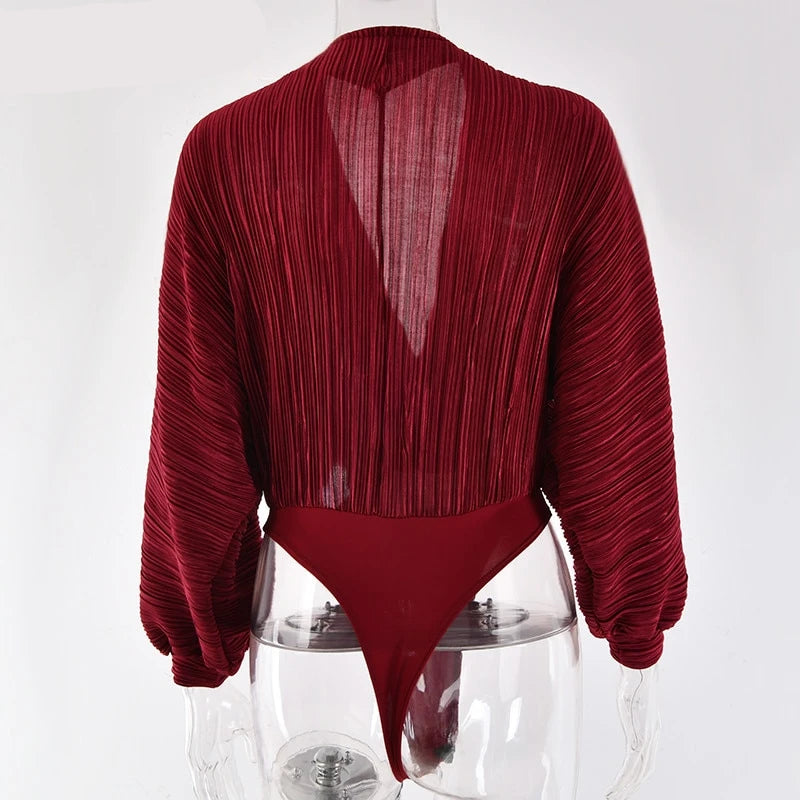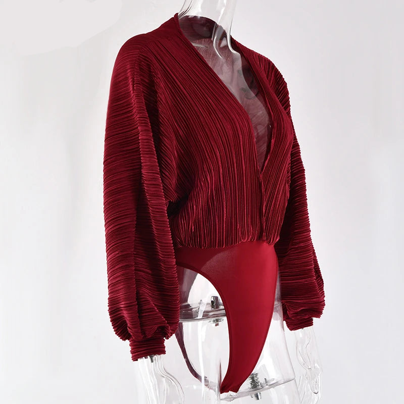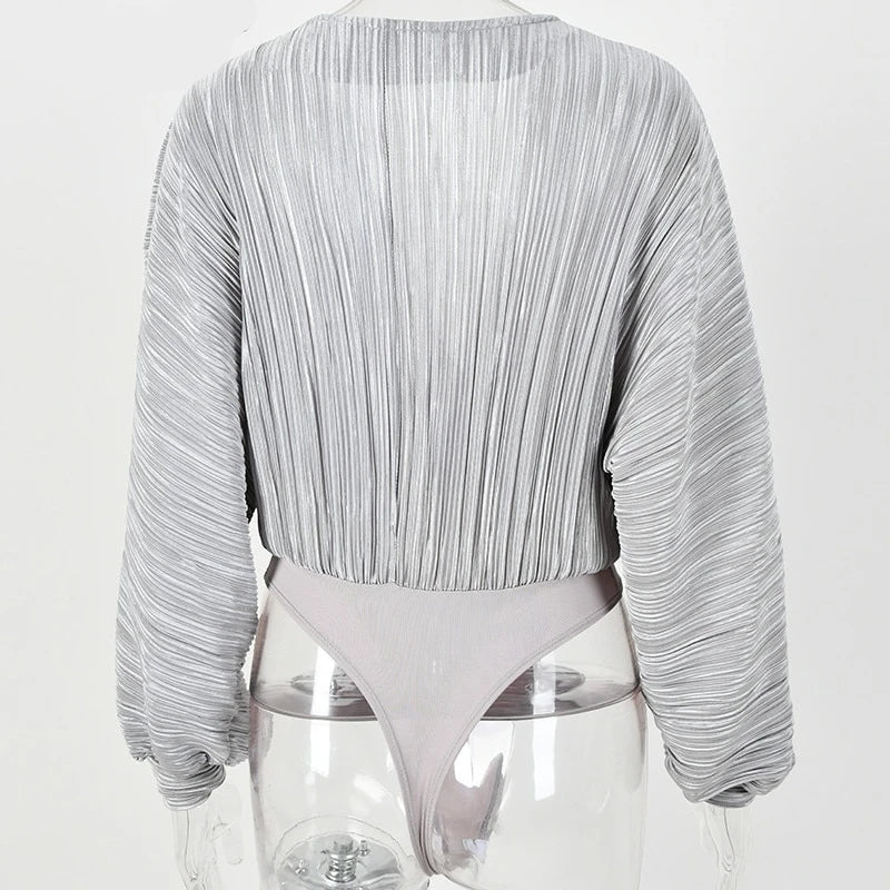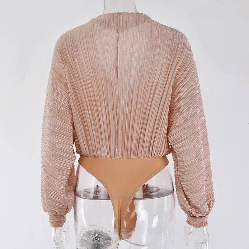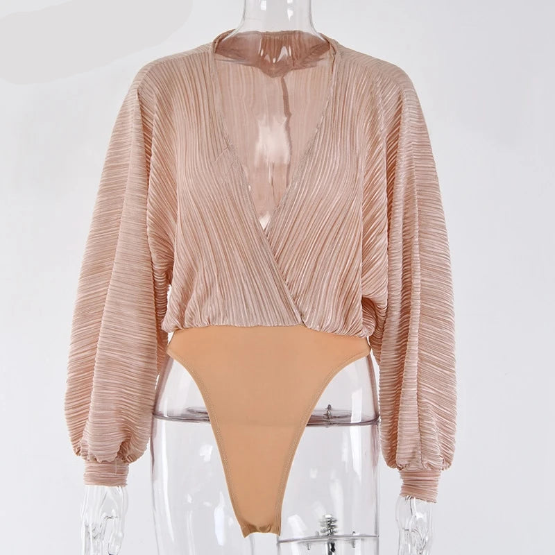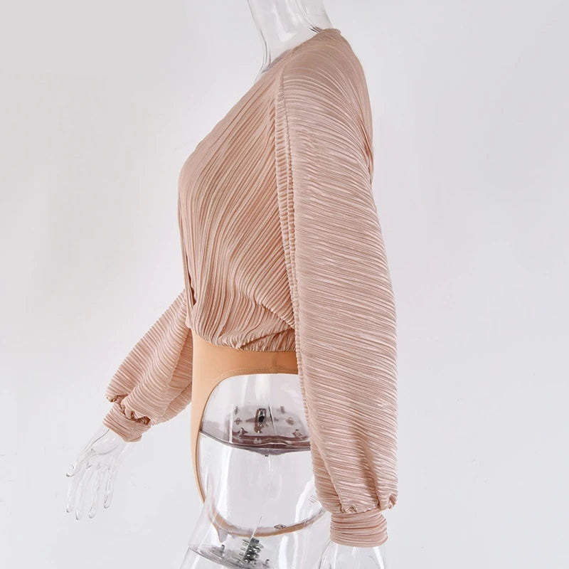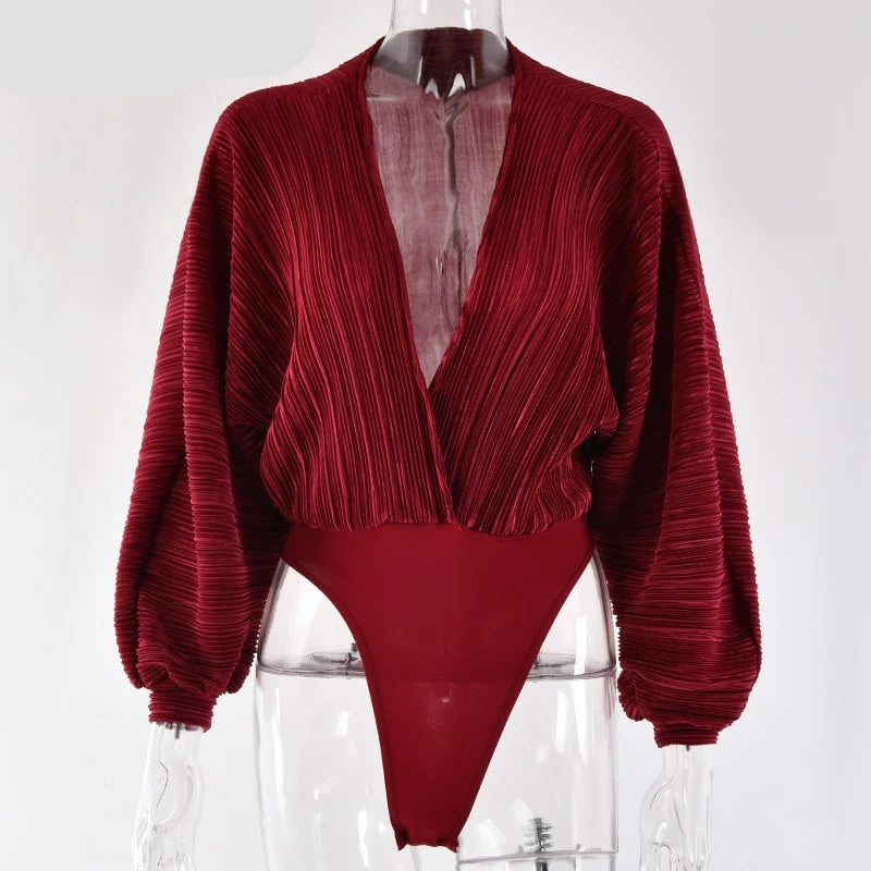 Body de manga larga con cuello en V de color liso de tela de paño fino de licra