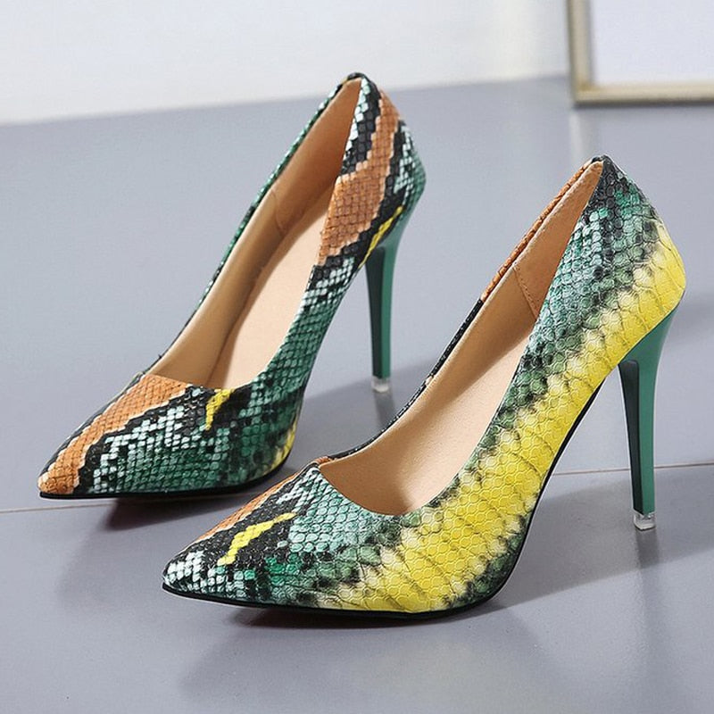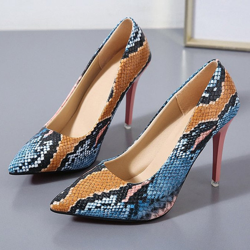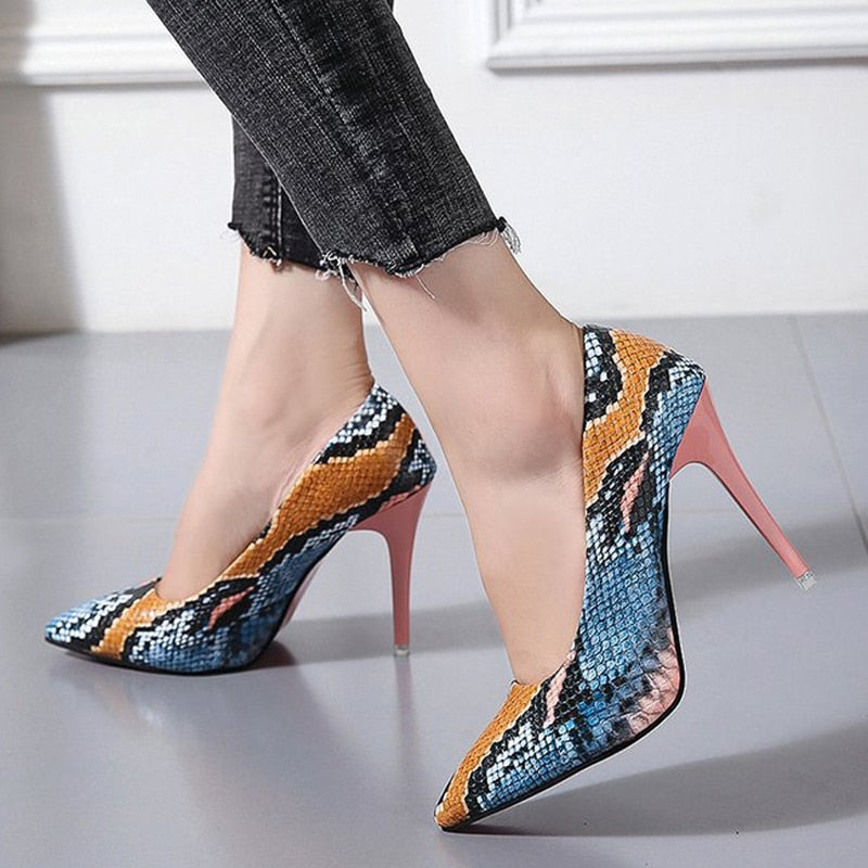 <transcy>Stiletto de punta puntiaguda con estampado de serpiente de cuero de PU</transcy>